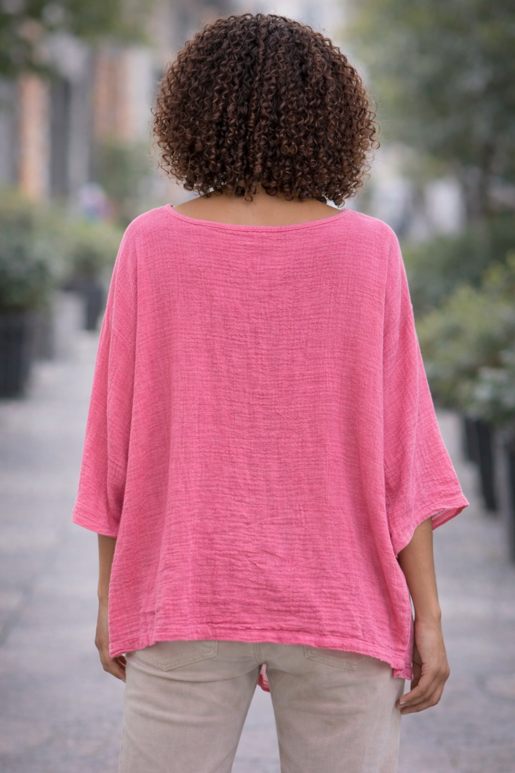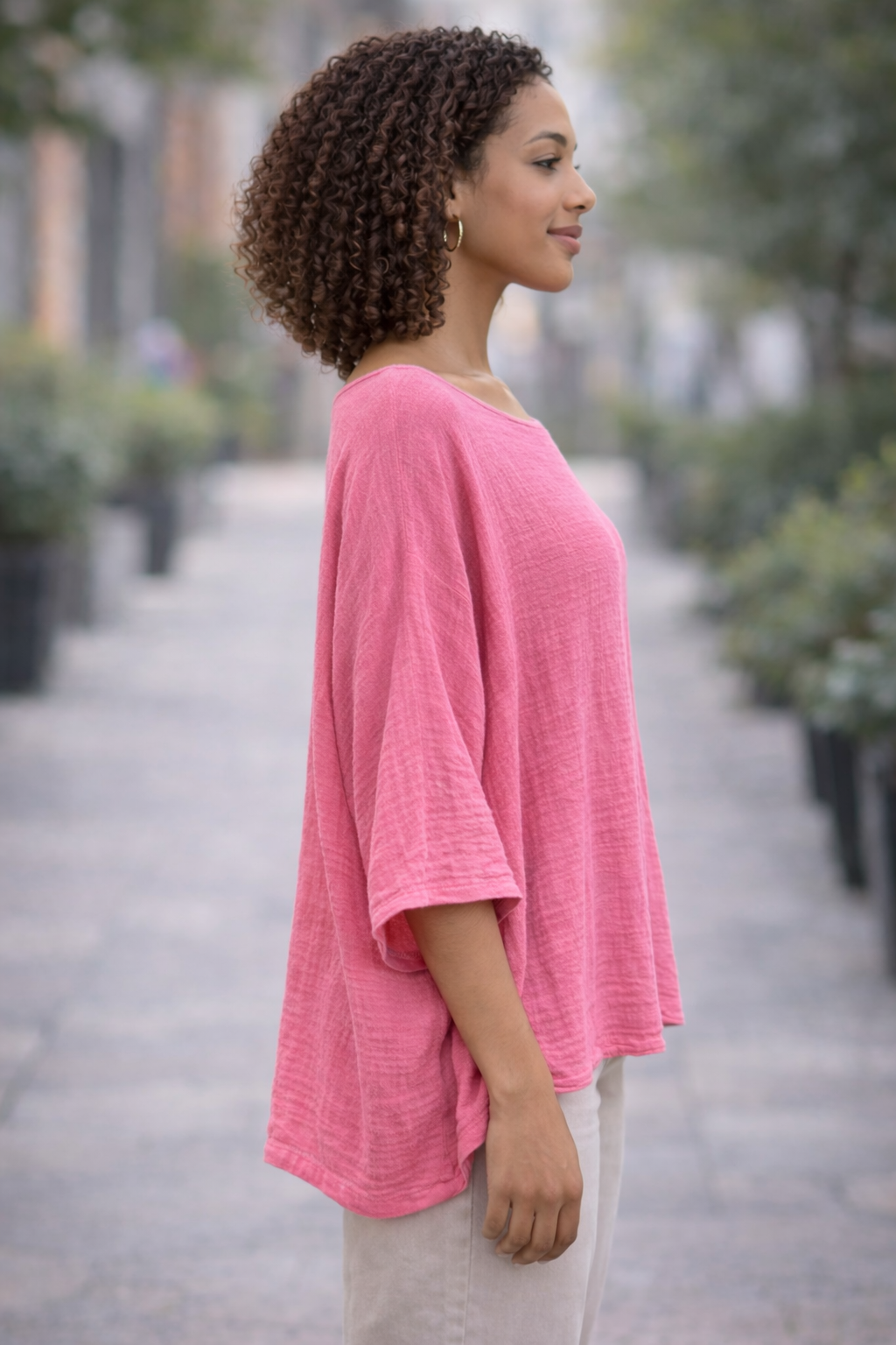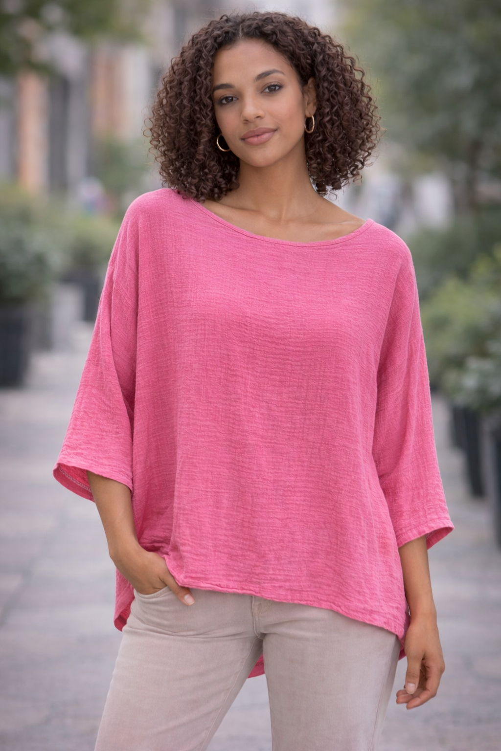 The relaxed, loose-fit silhouette drapes naturally over the body, creating a flattering shape without feeling restrictive. Its wide boat neckline adds a soft, feminine finish, while the batwing-style sleeves fall gently to a comfortable three-quarter length for an airy, laid-back feel. The longer back hem gives extra coverage and creates a beautiful flow when worn untucked, while still styling easily with a front tuck.