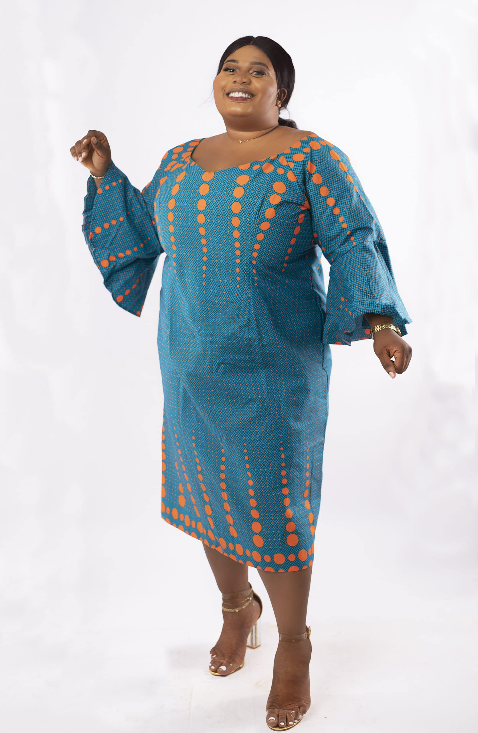 If your looking for a comfortable but beautiful dress for that special occasion then this blue plus size Serwa Ankara Occasion Midi Dress will be perfect for you. The 3/4 bell sleeves are loose fitting and with a sweetheart neckline, this dress has an elegant look.