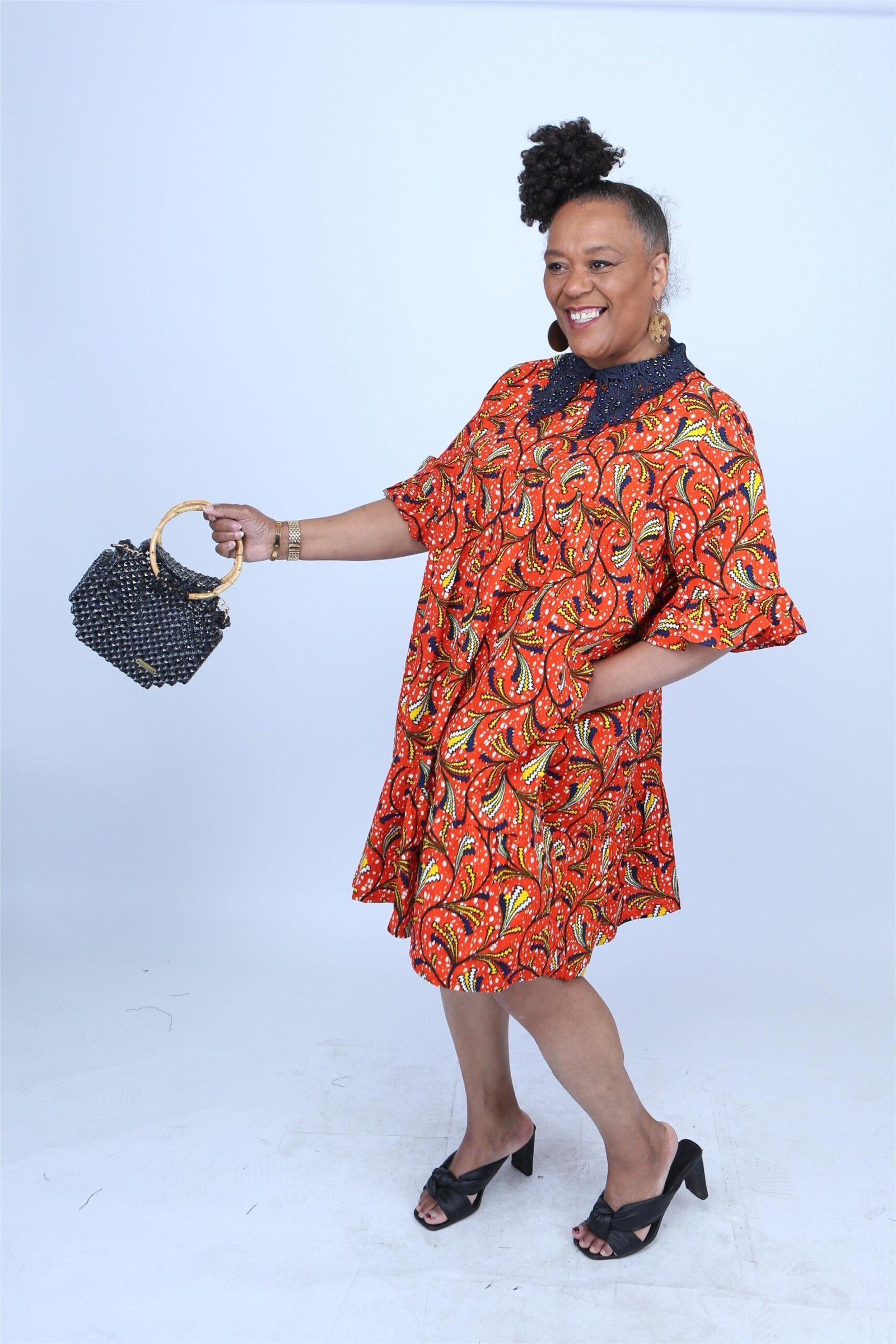 Looking for something eye-catching and fun? Our Blue Lace Collar Orange African Dress is just what you need! With our stunning floral pattern Blue collar, this dress is perfect for an exciting day out. The ruffle trim on the sleeves adds elegance to your dress, making it perfect for any occasion. Looking for convenience? This dress is also sewn with pockets, meaning you do not have to carry a purse with you at your event! Additionally, our dress is sewn with a loose and breathable cut making it easy to move around in.