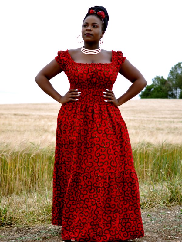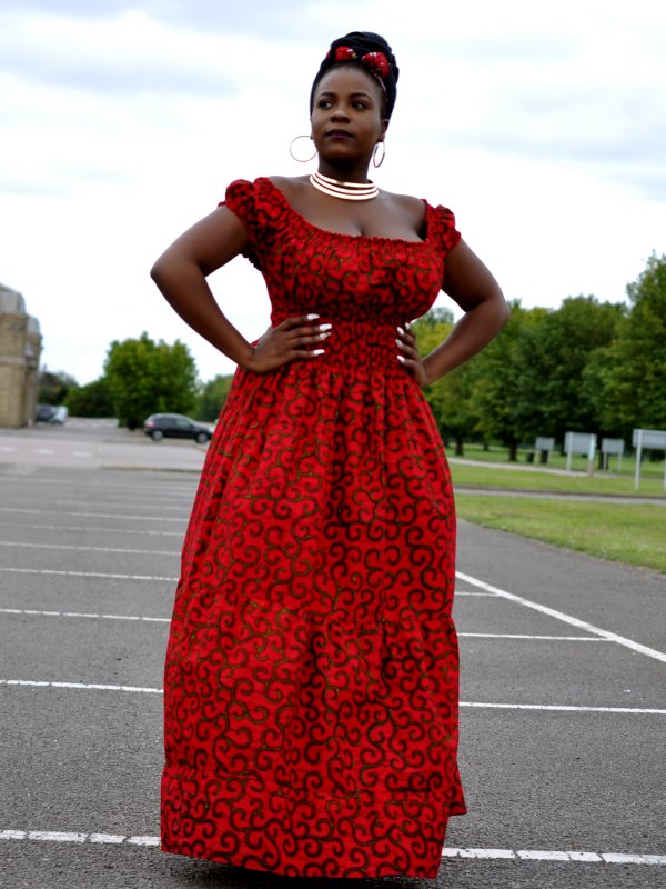 Our Red Ankara Print Maxi Dress with a beautiful African print design is perfect to wear for a summer occasion or event. Features a flattering square neckline and cap sleeves so you can wear it off shoulder to enhance your silhouette. Pair with some jewellery and nice heels or sandals.