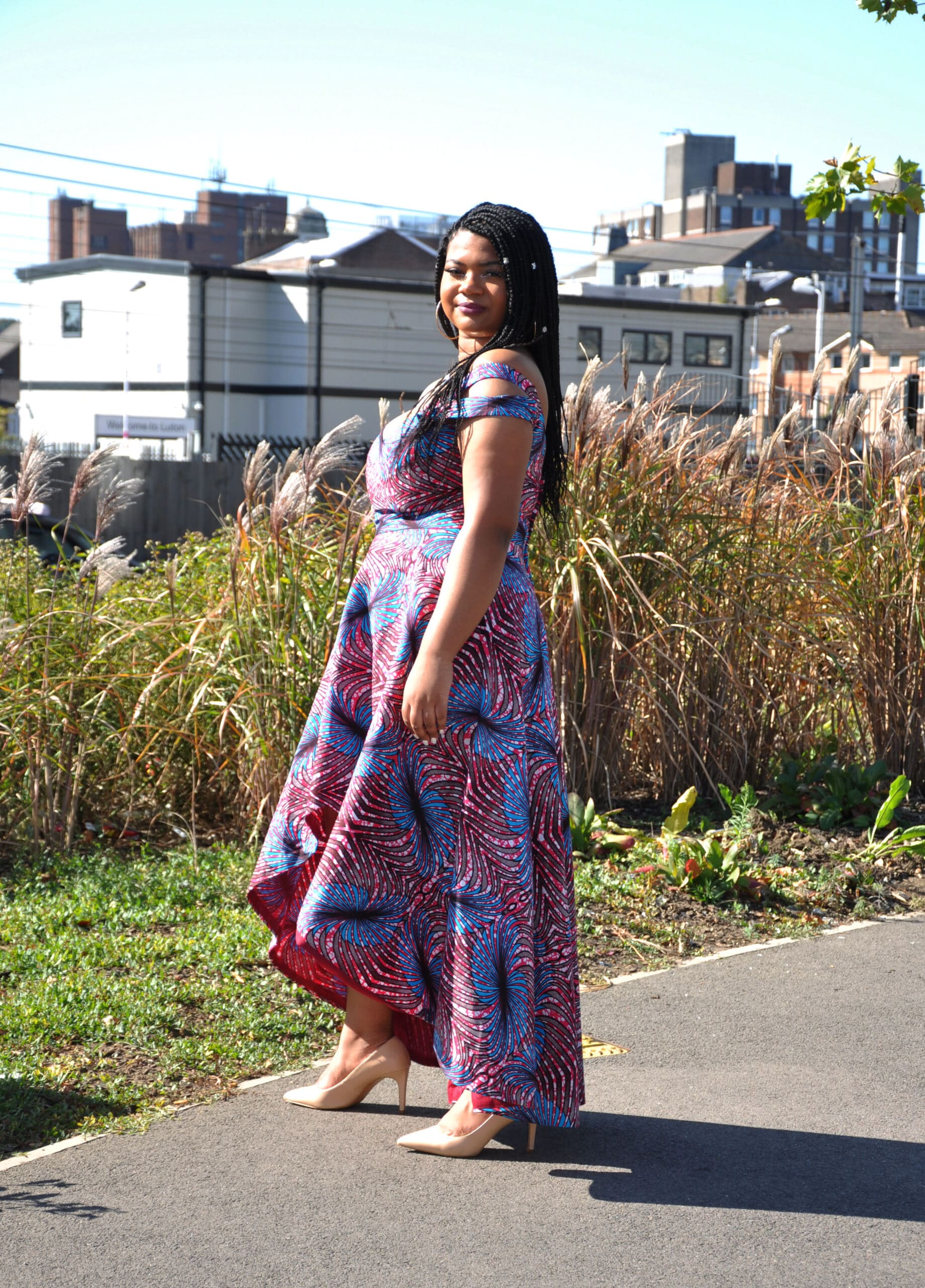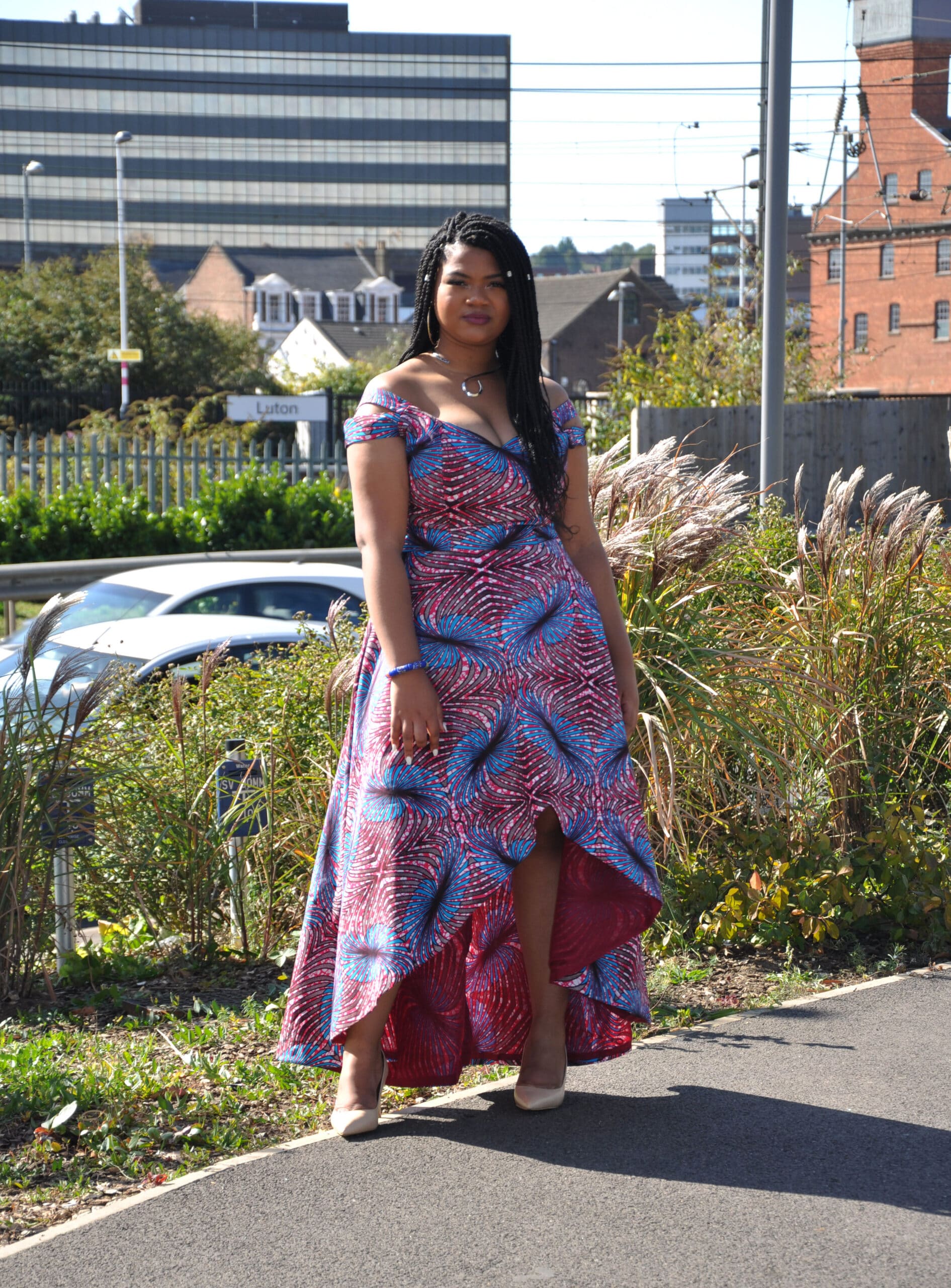This gorgeous red and blue African print dress features a feather Ankara pattern and a high-low design. The off shoulder neckline and flared hem gives this dress elegance and beauty.