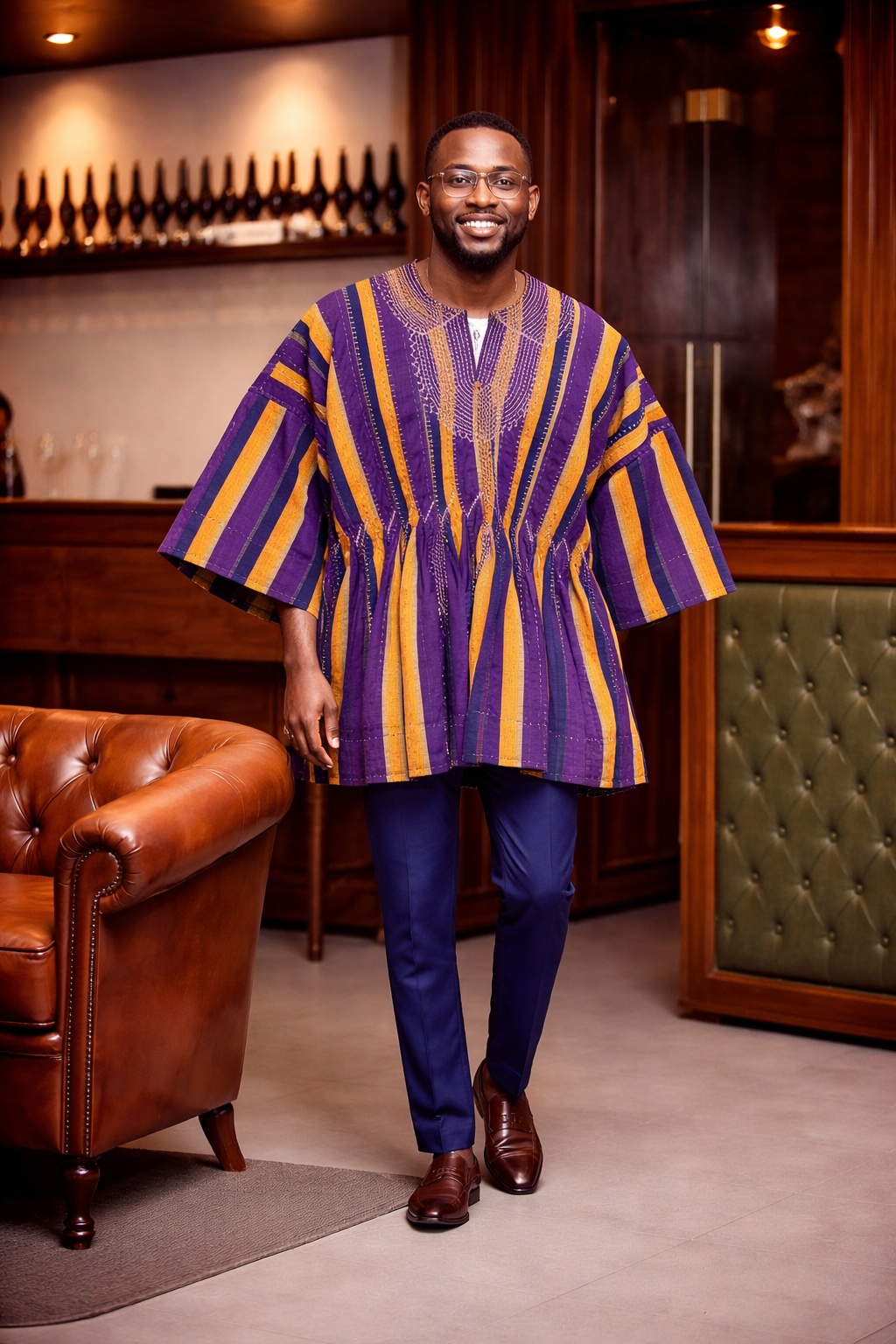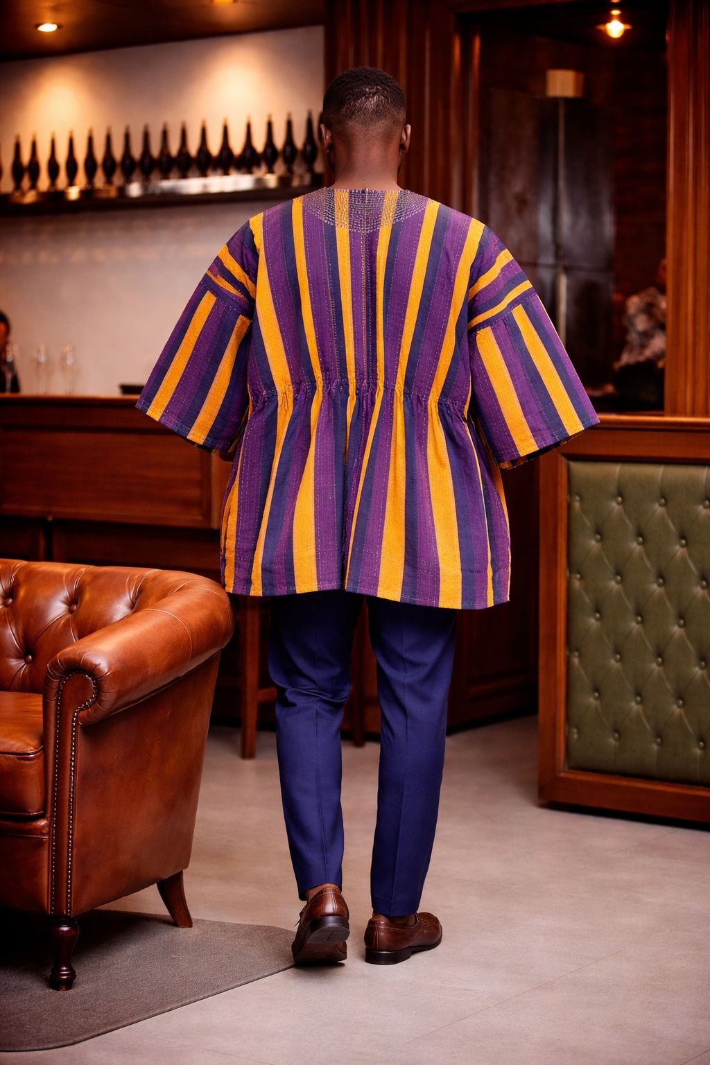 At first glance, this Fugu top stands out with its deep amethyst tone and bright gold vertical stripes. The contrast creates a strong and eye-catching appearance. In addition, the embroidered neckline adds a refined, handcrafted touch that highlights authentic Ghanaian craftsmanship.
