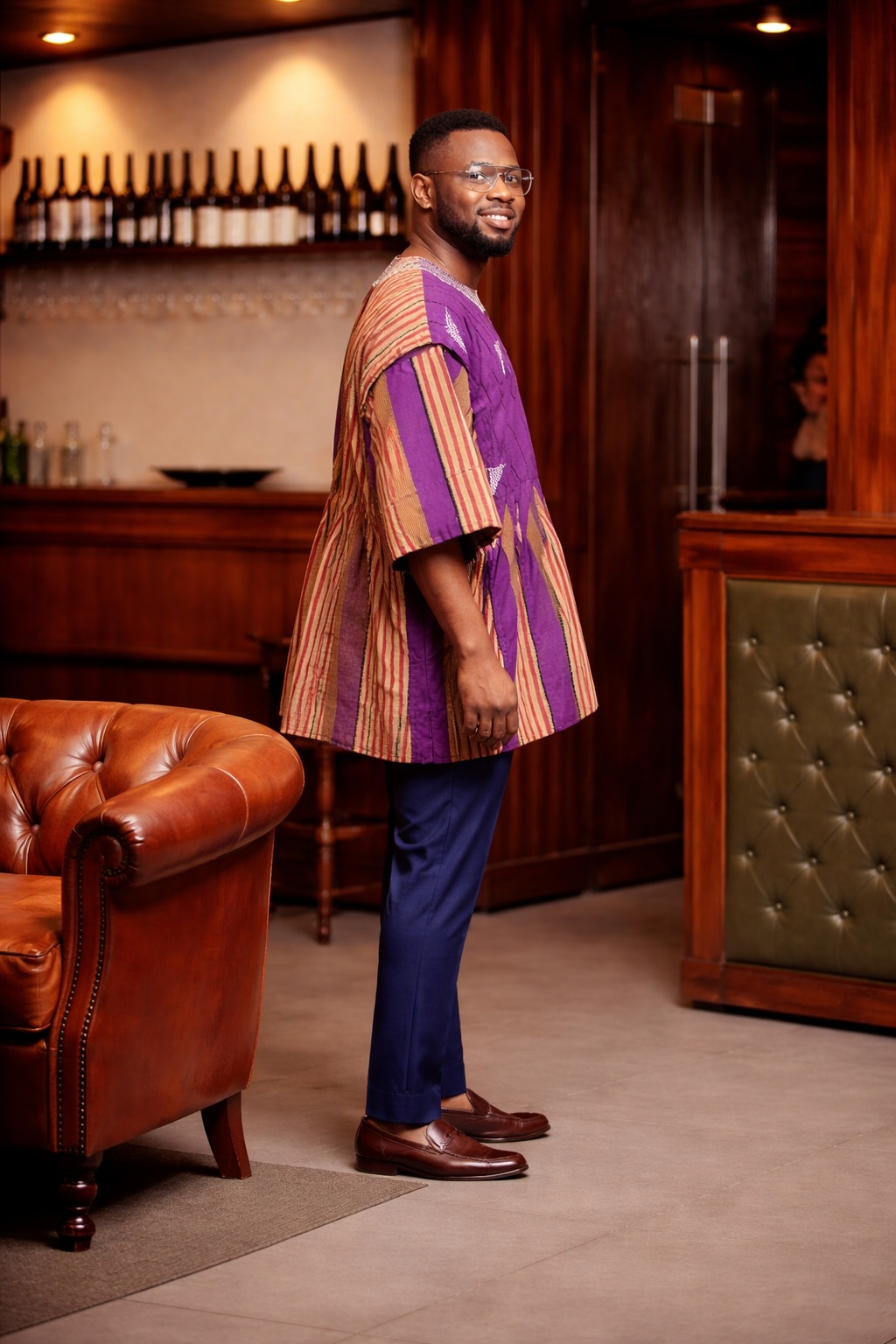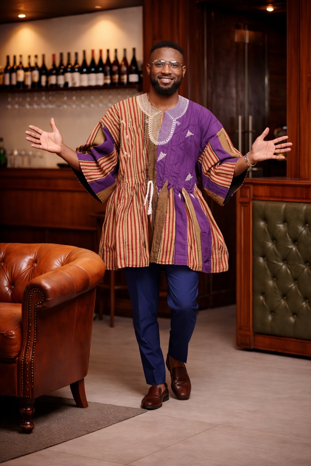 Stand out with bold cultural expression in the Royal Fusion Heritage Fugu Smock Top. Inspired by the traditional Batakari of Northern Ghana, this unique piece combines rich purple panels with warm earth-toned stripes. As a result, it creates a striking fusion of colour, texture, and heritage with a modern twist.