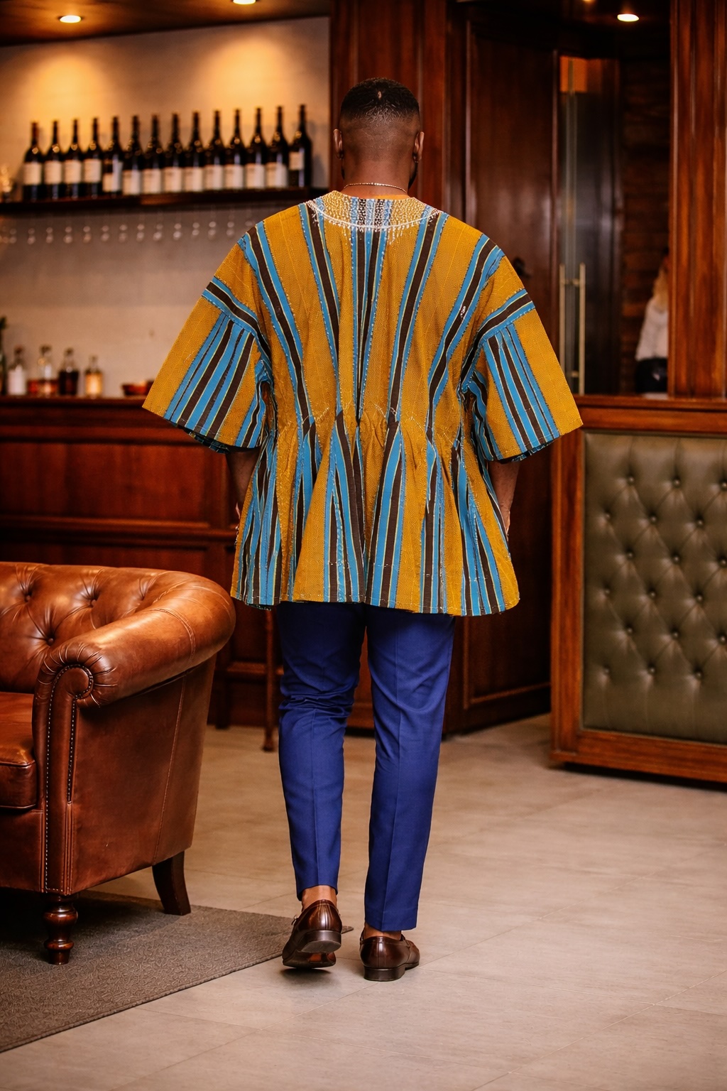Thanks to its bold yet balanced colour combination, this Fugu top can be styled in different ways. For example, pair it with tailored trousers and loafers for weddings, celebrations, or cultural events. Alternatively, wear it with simple trousers for a relaxed but polished everyday look. As a result, it transitions easily between formal and casual settings.