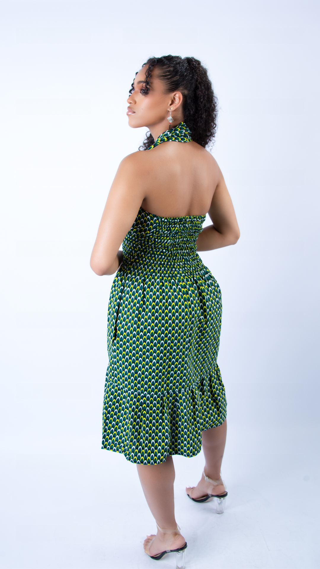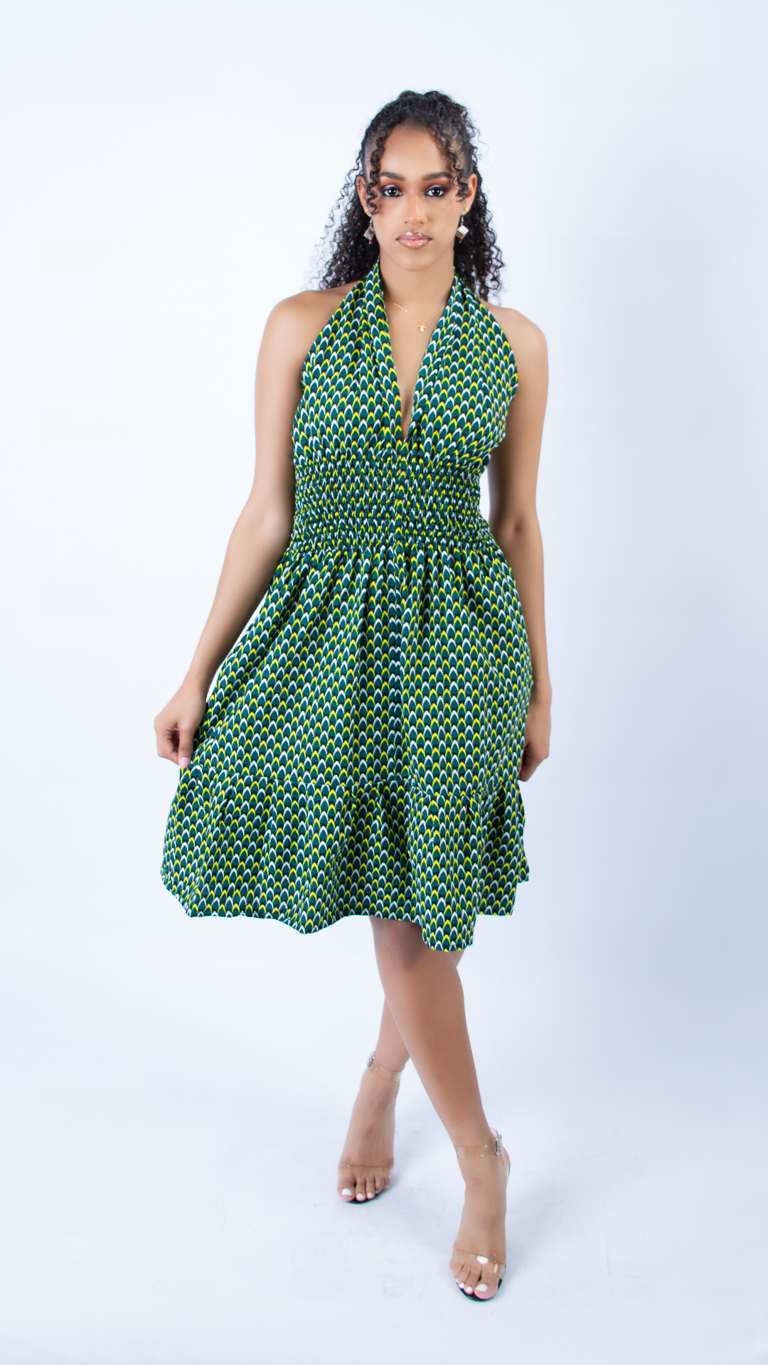 Unleash your confidence and showcase your bold sense of fashion with our Gorgeous Green Ankara Halter Neck Playful Swing Dress. Embrace the beauty of African culture