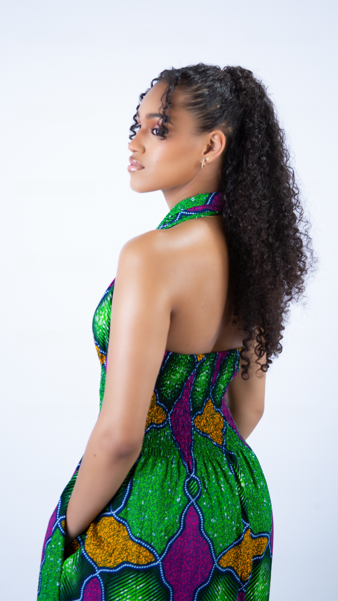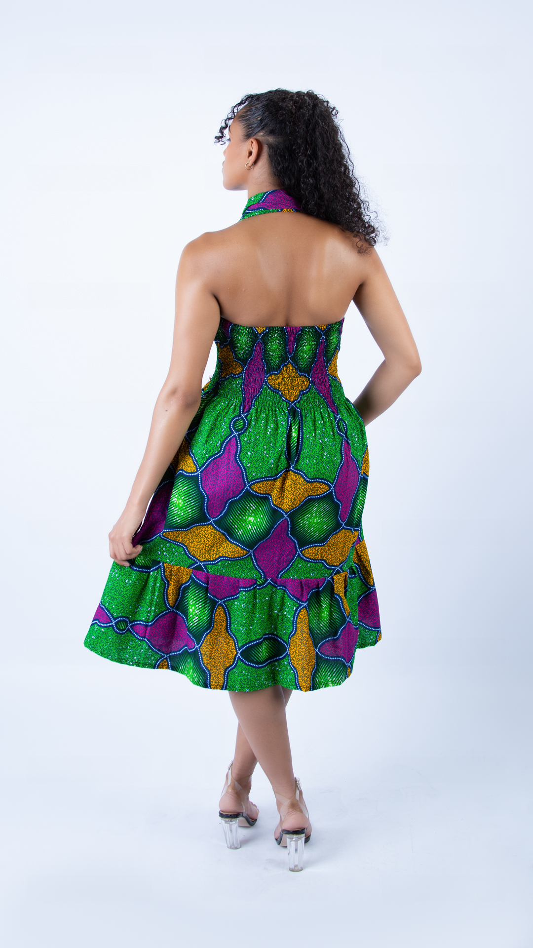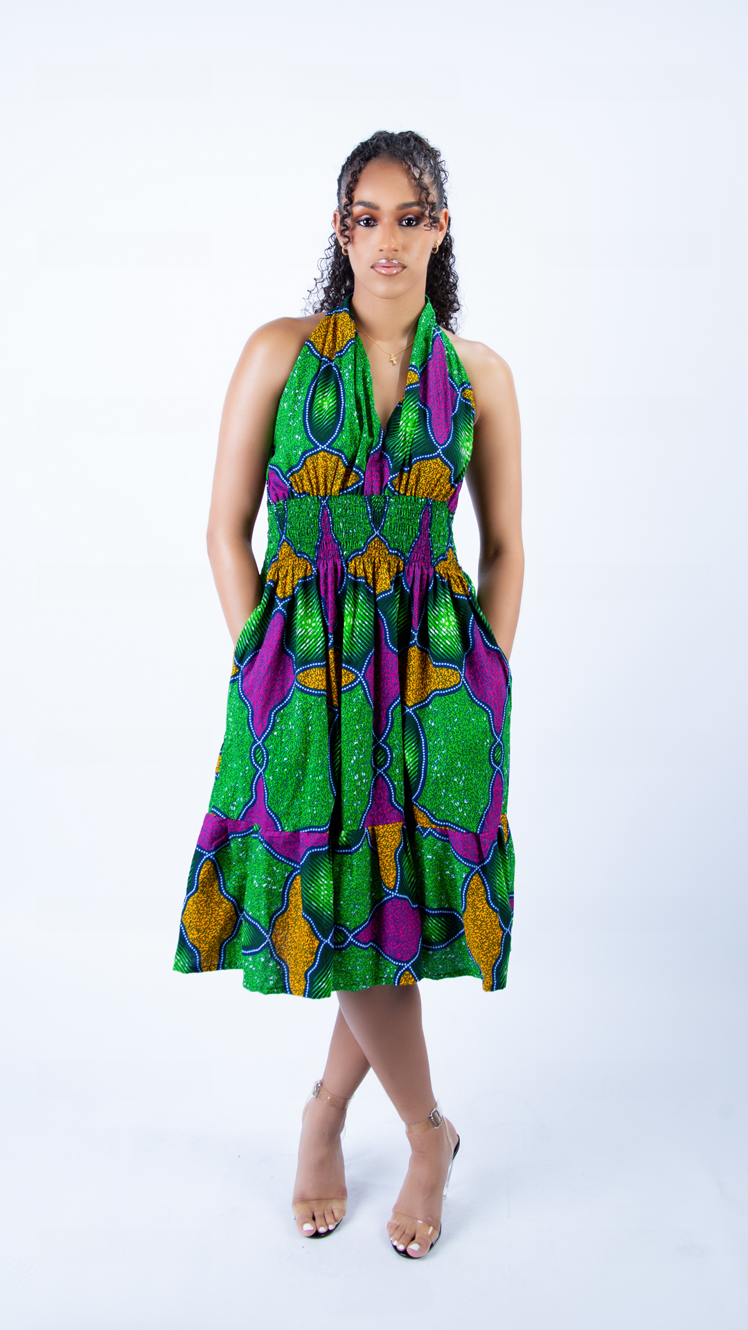 Step out in style with our Beautiful Ankara Halter Neck Playful Swing Dress, a delightful blend of modern elegance and vibrant African culture. Made in Ghana, this eye-catching dress showcases a stunning Ankara print that celebrates the rich colors and patterns of African heritage.
