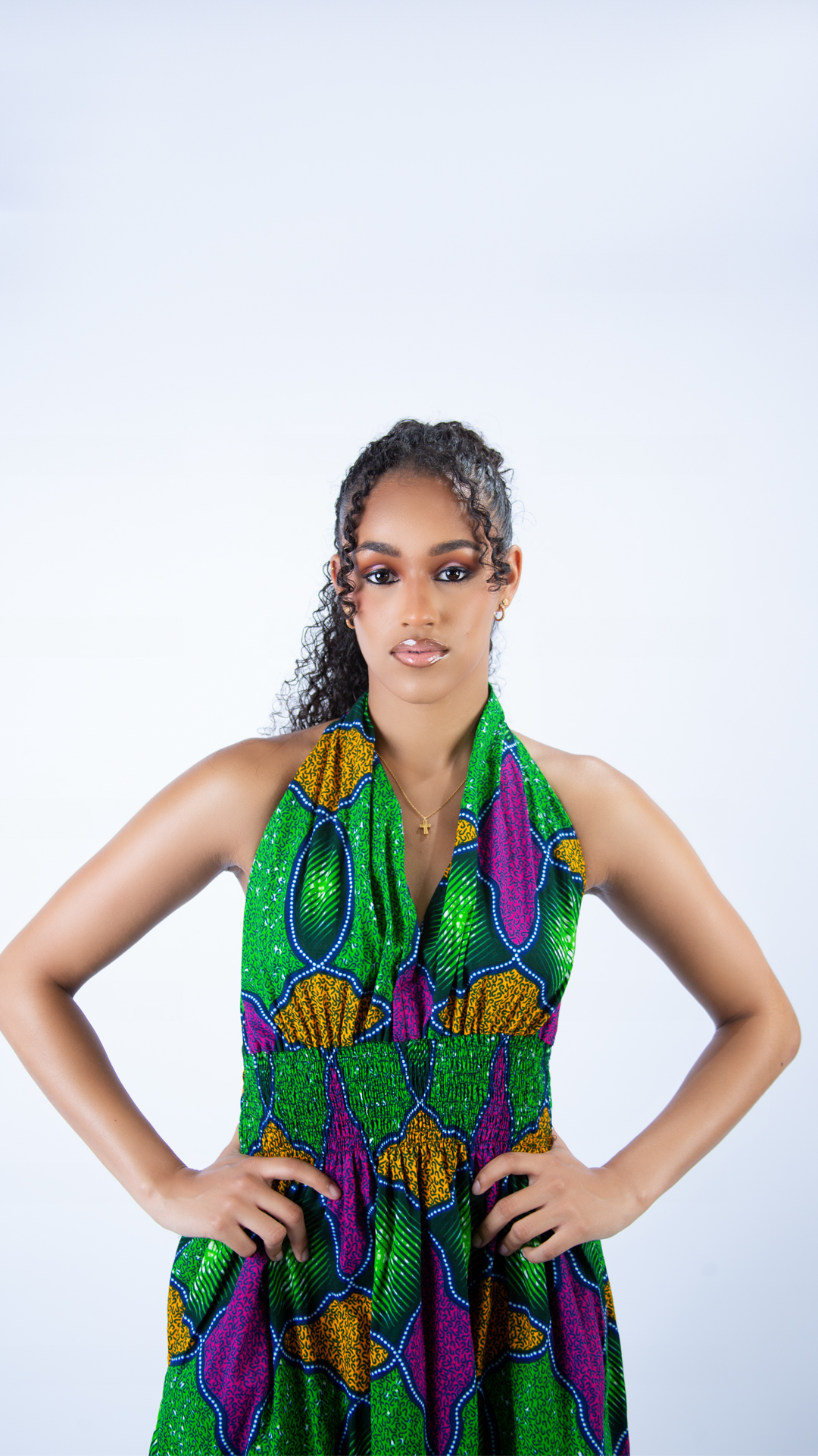 Unleash your confidence and showcase your bold sense of fashion with our Great Green Multicolour Ankara Halter Neck Swing Dress. Embrace the beauty of African culture