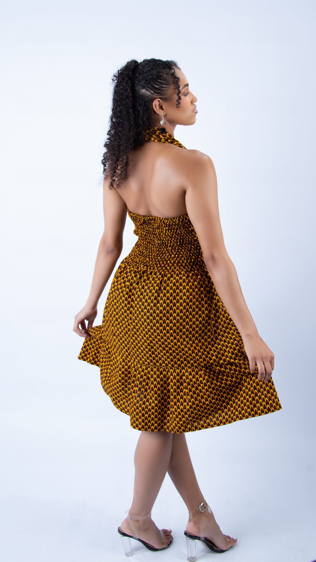 Step out in style with our Beautiful Ankara Halter Neck Playful Swing Dress, a delightful fusion of modern elegance and vibrant African culture. Our clothes are expertly handmade in Ghana. This eye-catching dress showcases a stunning Ankara print that pays homage to the rich colours and intricate patterns of African heritage.