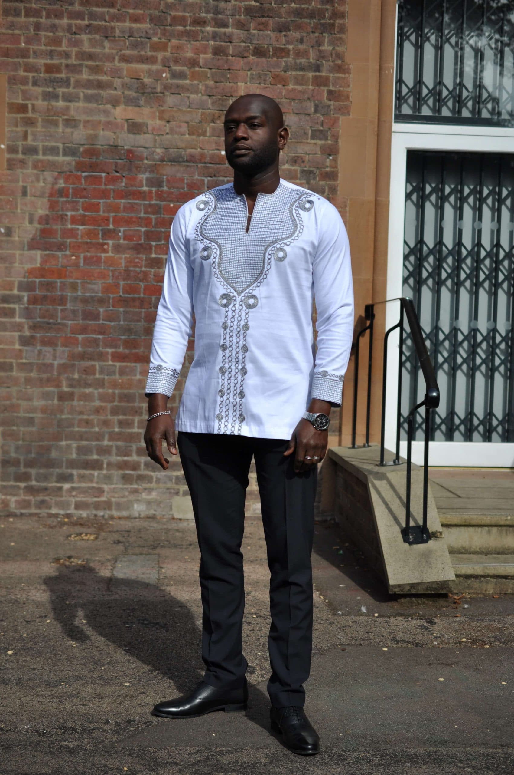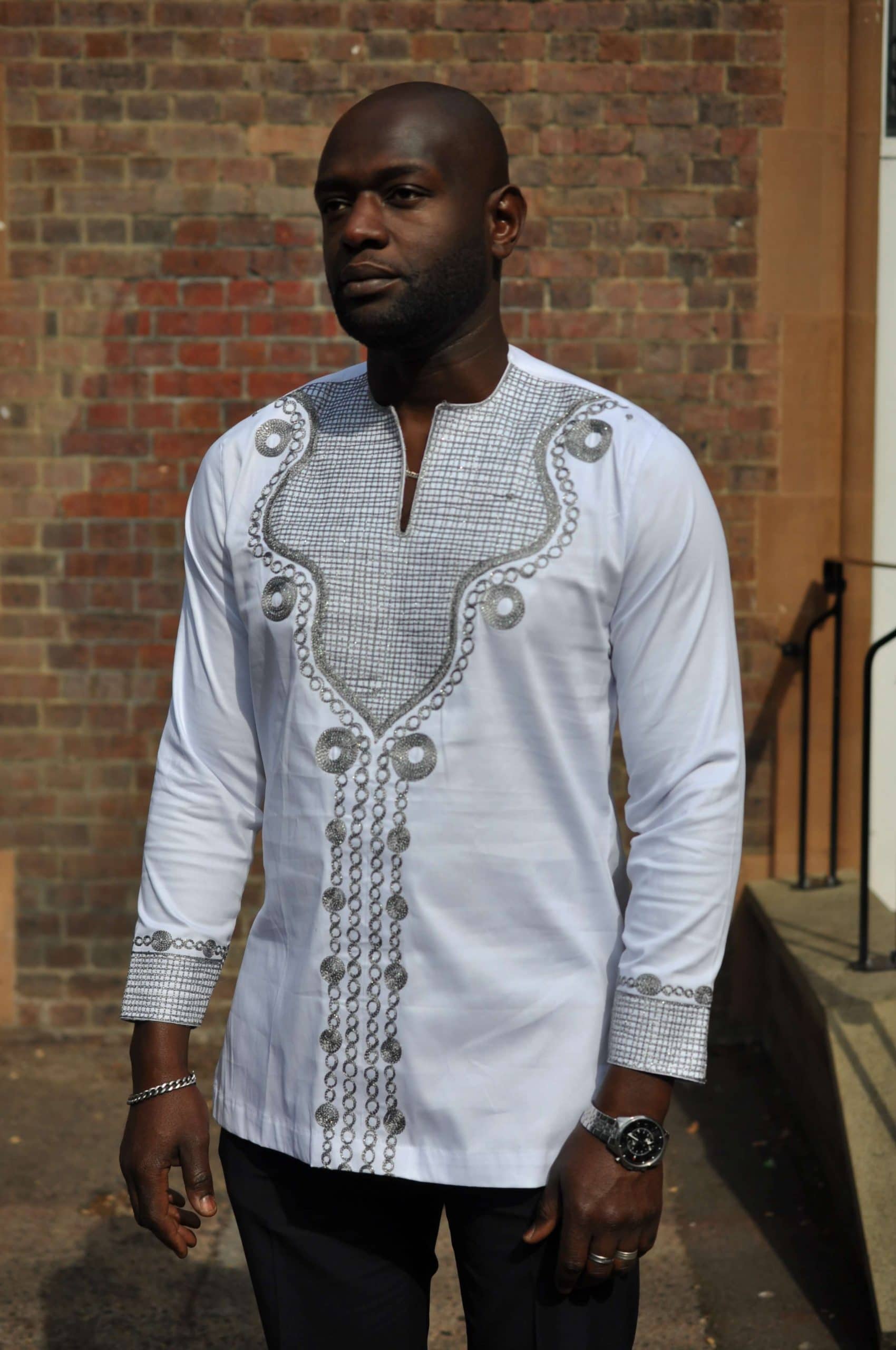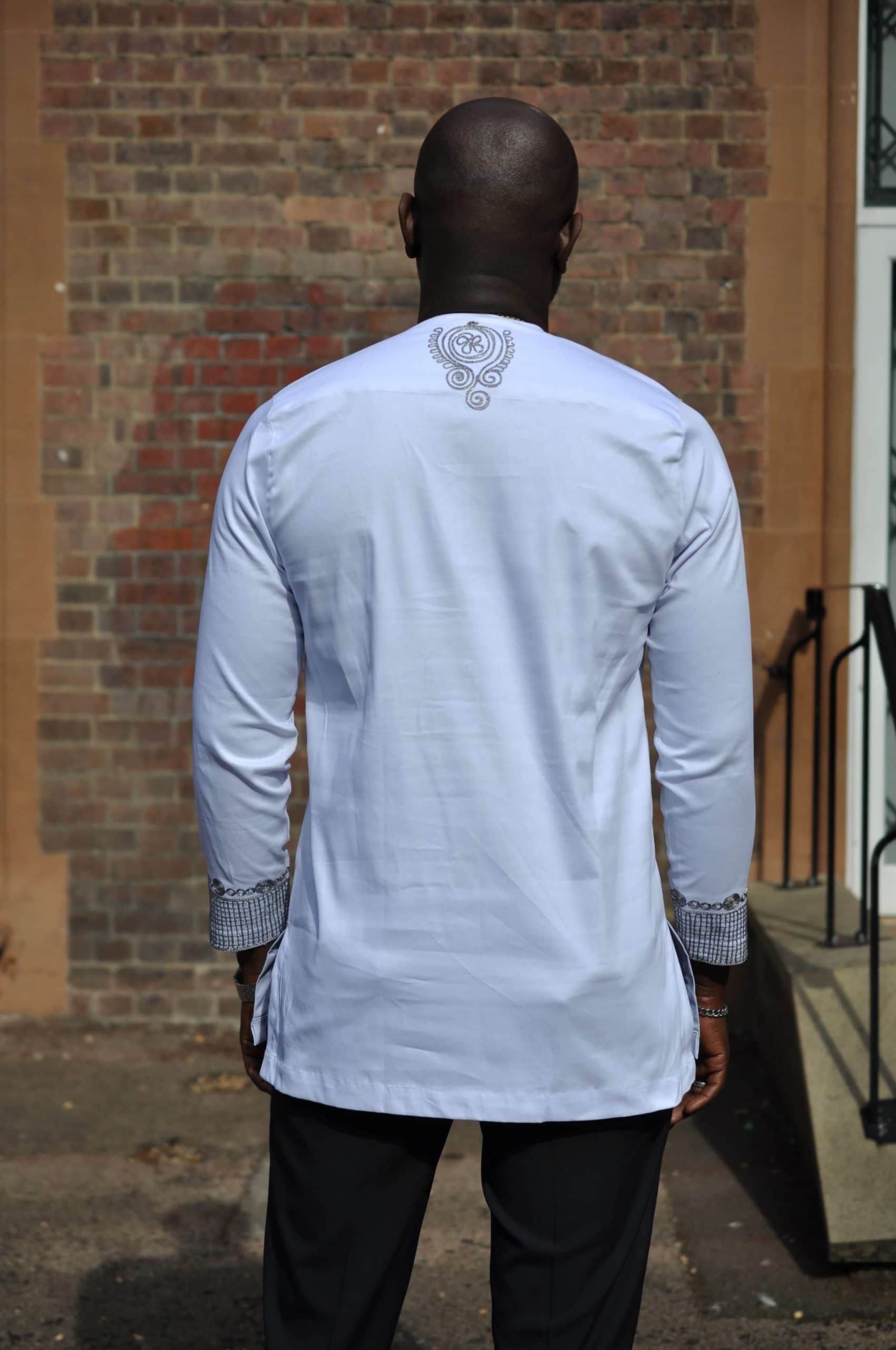 Looking for a special occasion shirt? Then this men’s traditional white shirt with beautiful silver African embroidery is perfect for you! An African-inspired design with a modern European twist, this shirt is perfect for any occasion such as weddings, engagement parties and other similar outings. Worldwide Shipping is available and we also offer free delivery in the UK!