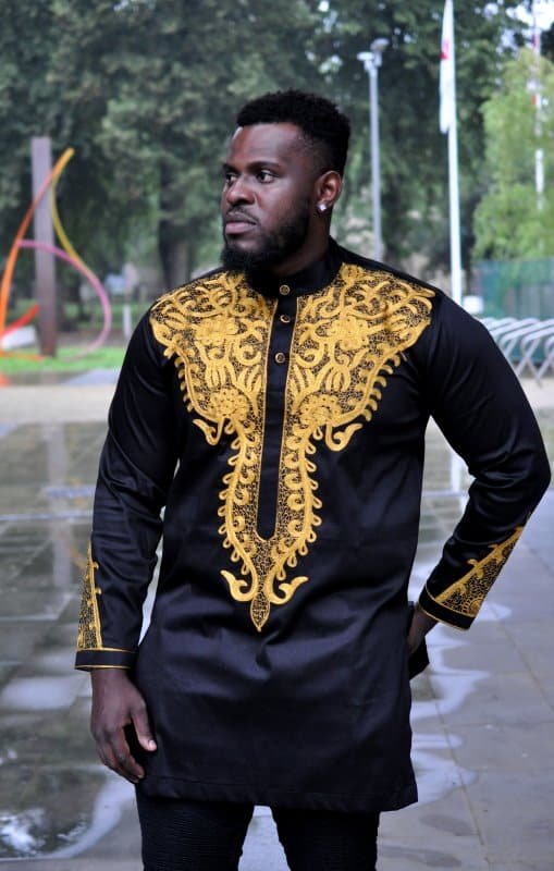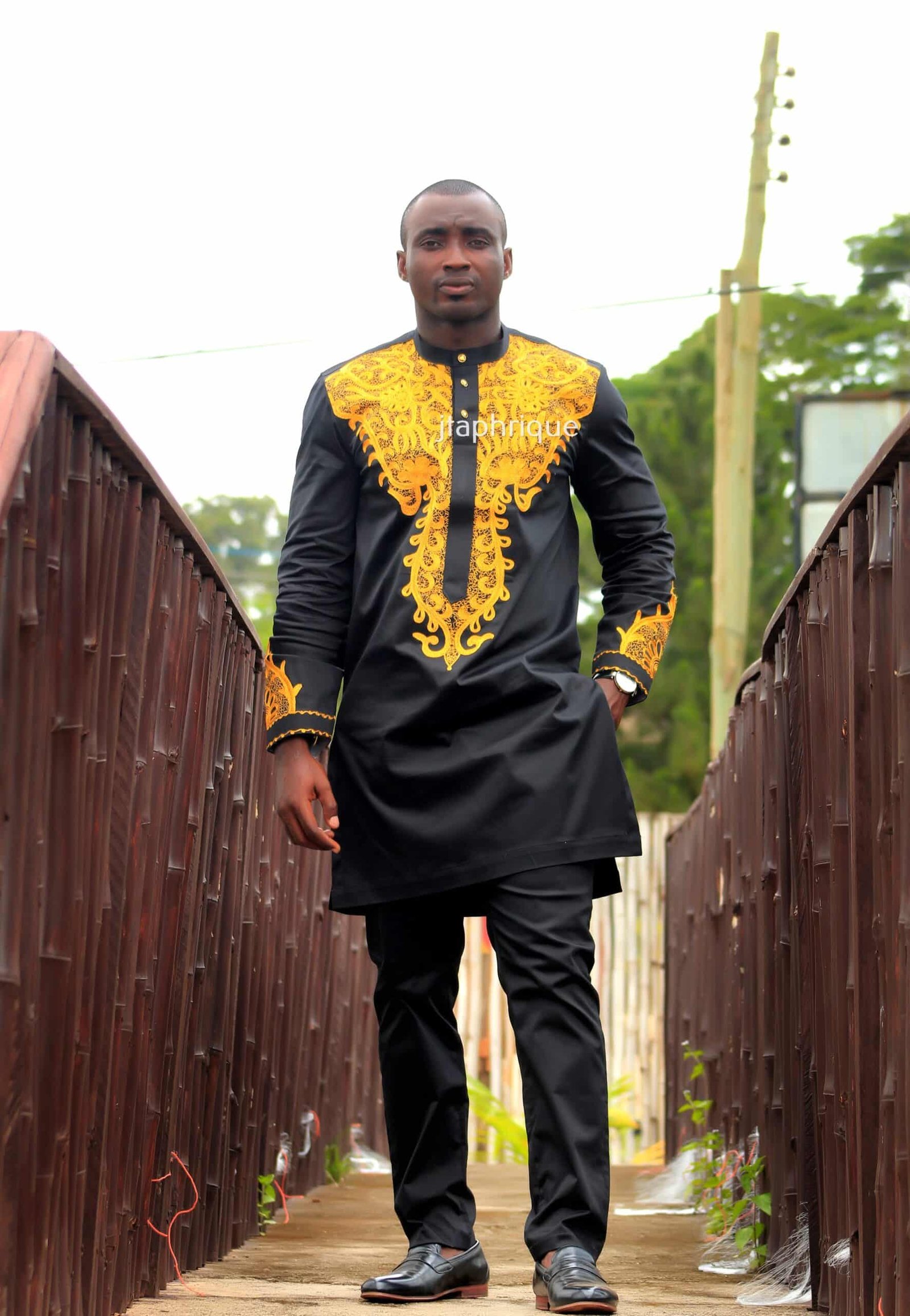 This outstanding black & gold Panther-inspired embroidered two piece suit is fit for a king! Features stunning intricate embroidery on the neckline and cuffs – this African suit with gold embroidery is perfect for special occasions and formal events. Wakanda forever! Buy the two piece suit set (includes the shirt and trousers) or buy the top or pants separately.