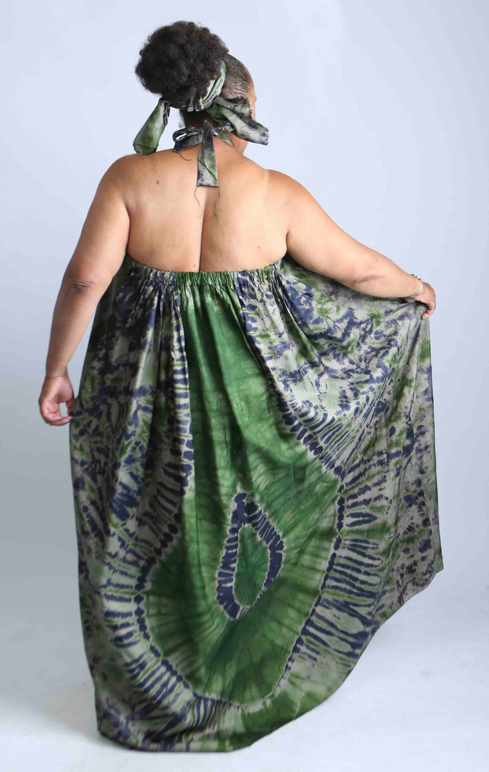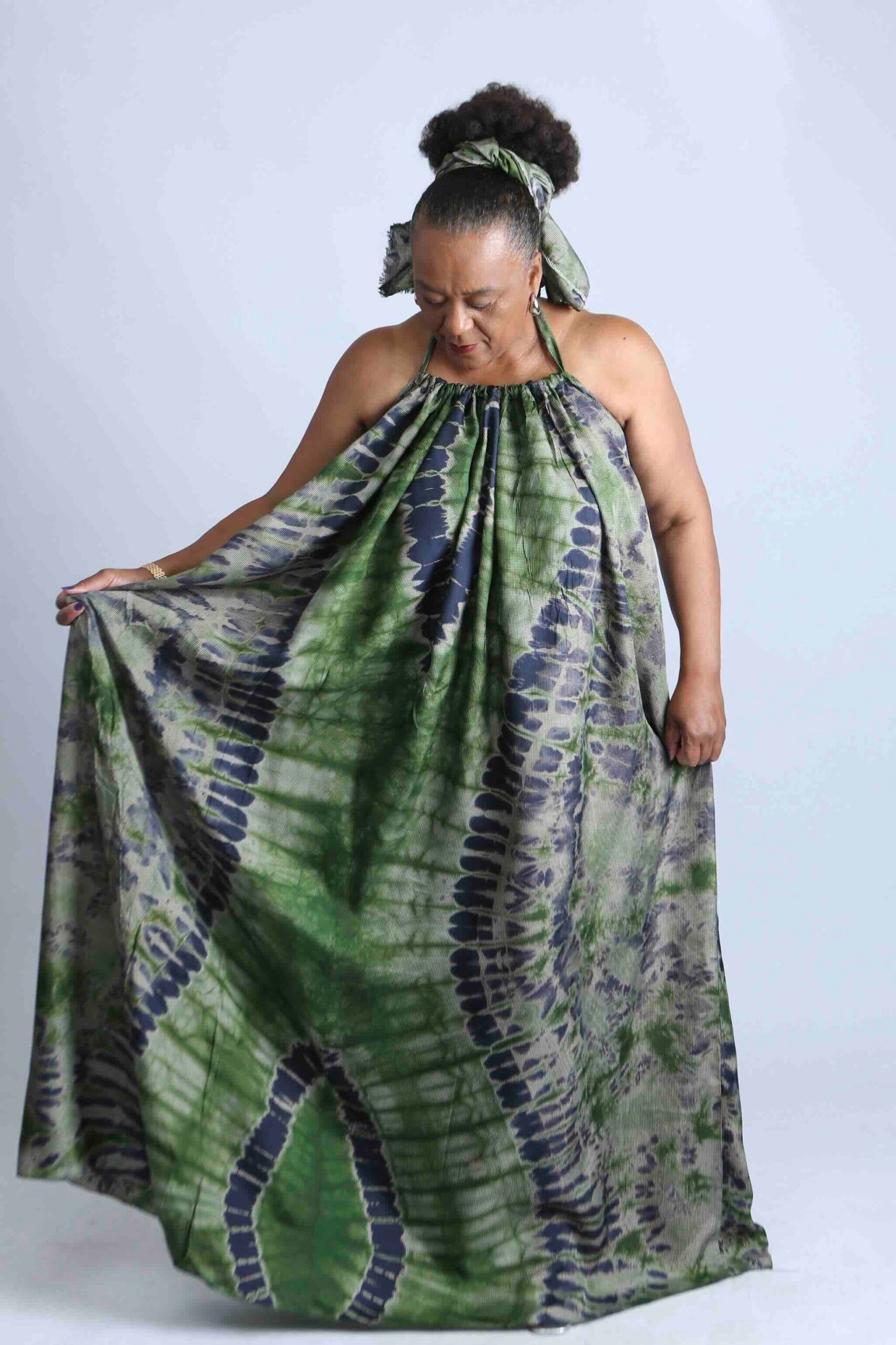 Flowing green tie-dye maxi dress with matching headscarf