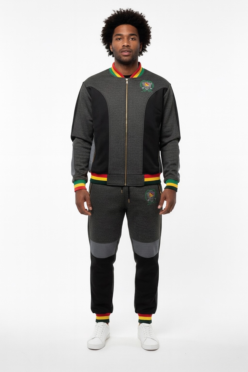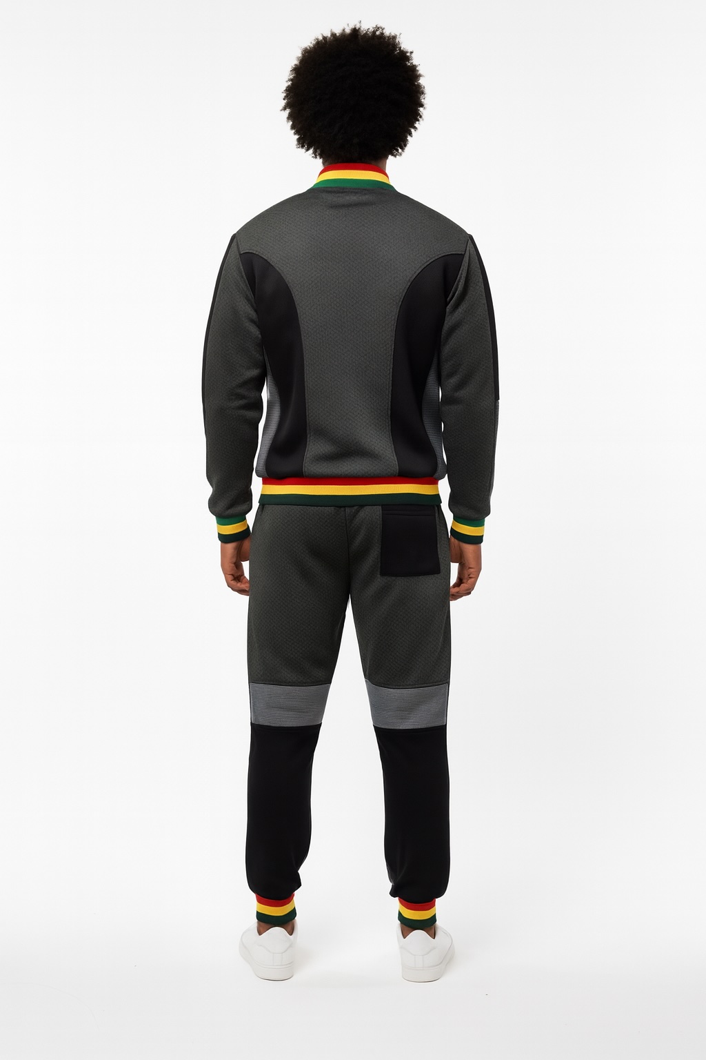 Stay warm, stylish, and confident with this Unisex Rasta Trim Tracksuit Set. It is modern, versatile, and easy to wear. Because of its athletic streetwear style, the tracksuit adds character and a clean silhouette to any outfit. It features a smooth fabric blend, colour-blocked grey and black panels, and bold Rasta-inspired rib trims that elevate casual and sporty looks. As a result, every piece delivers a polished yet expressive style. The premium stitching and high-quality embroidery also give it a durable and refined feel.