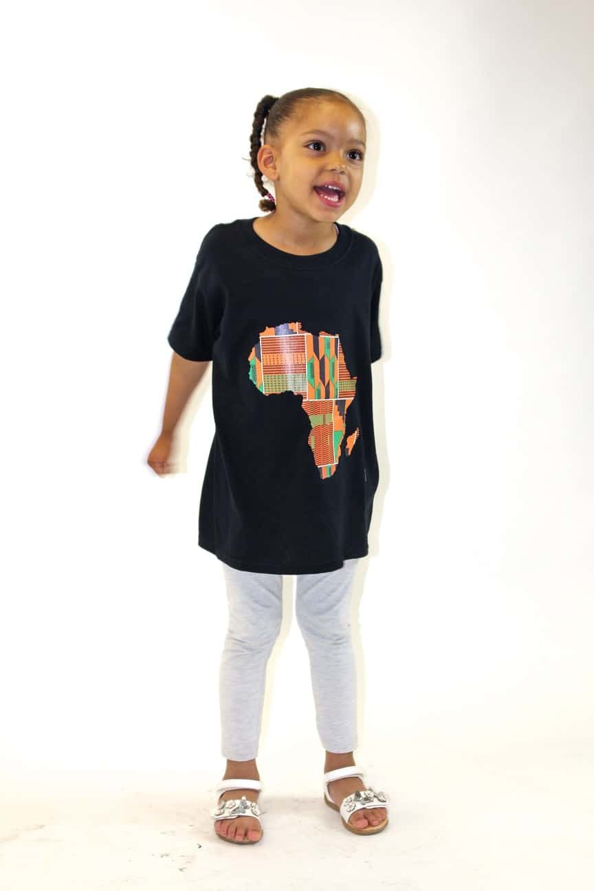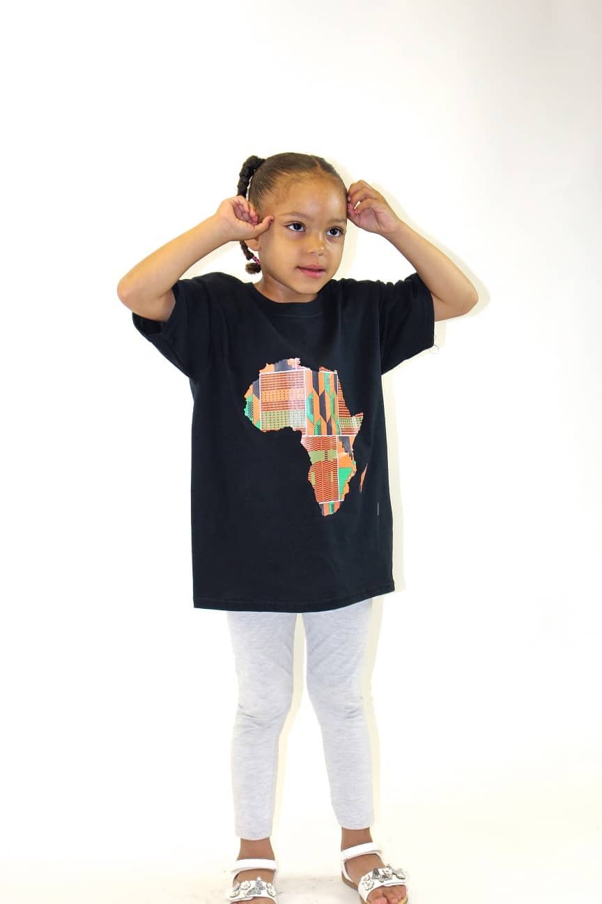 This cute, unisex African map black t-shirt featuring a map of Africa in Kente print colours is perfect for kids in Spring.  Ideal over jeans, shorts or a skirt.