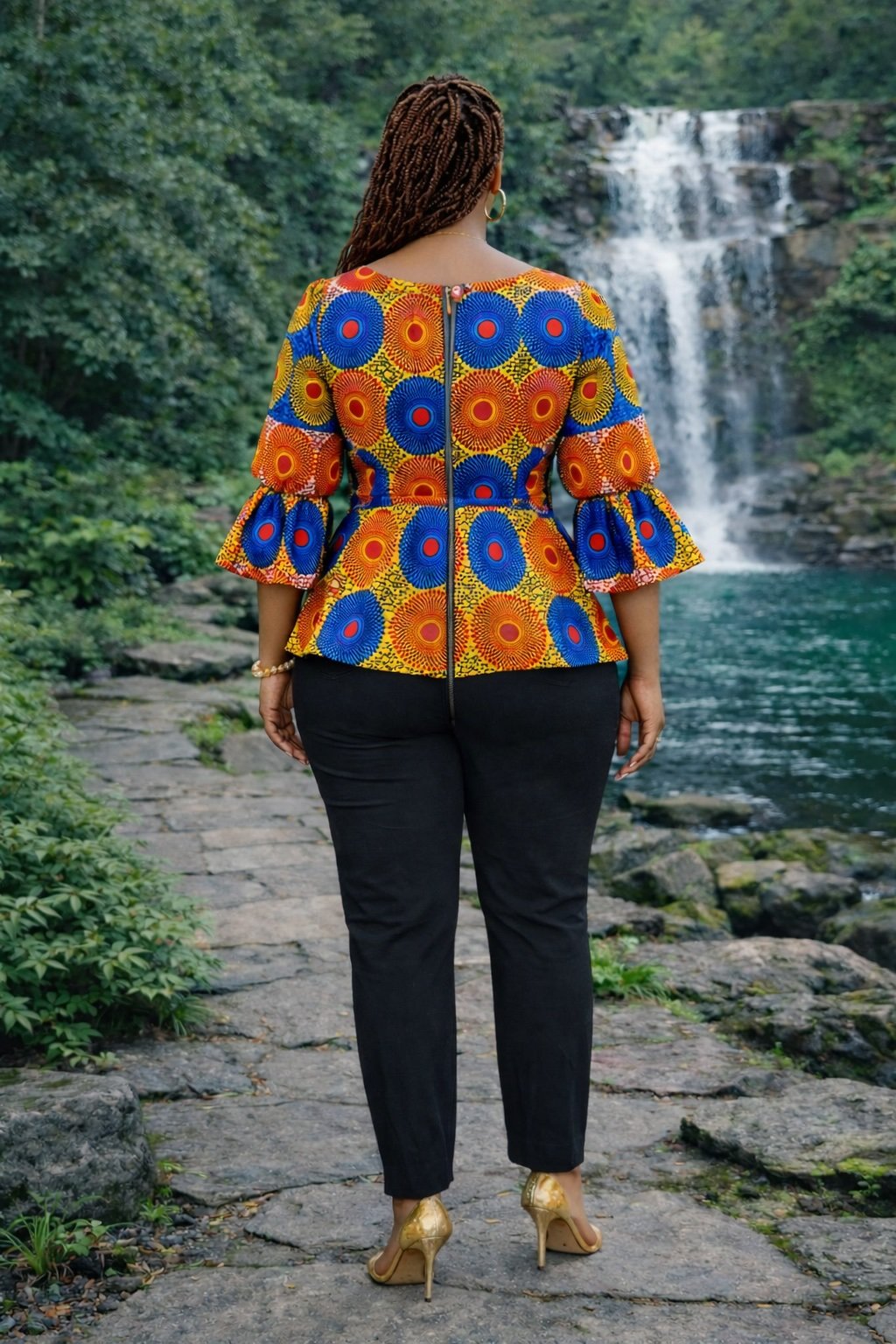 Elevate your wardrobe with the Vibrant Circular Print African Peplum Blouse, a striking fusion of bold African heritage and contemporary tailoring. Crafted from premium African wax print fabric, this eye-catching piece features dynamic circular motifs in vivid red, yellow, and blue tones, creating a lively yet sophisticated design that celebrates culture while remaining effortlessly stylish for modern wear.