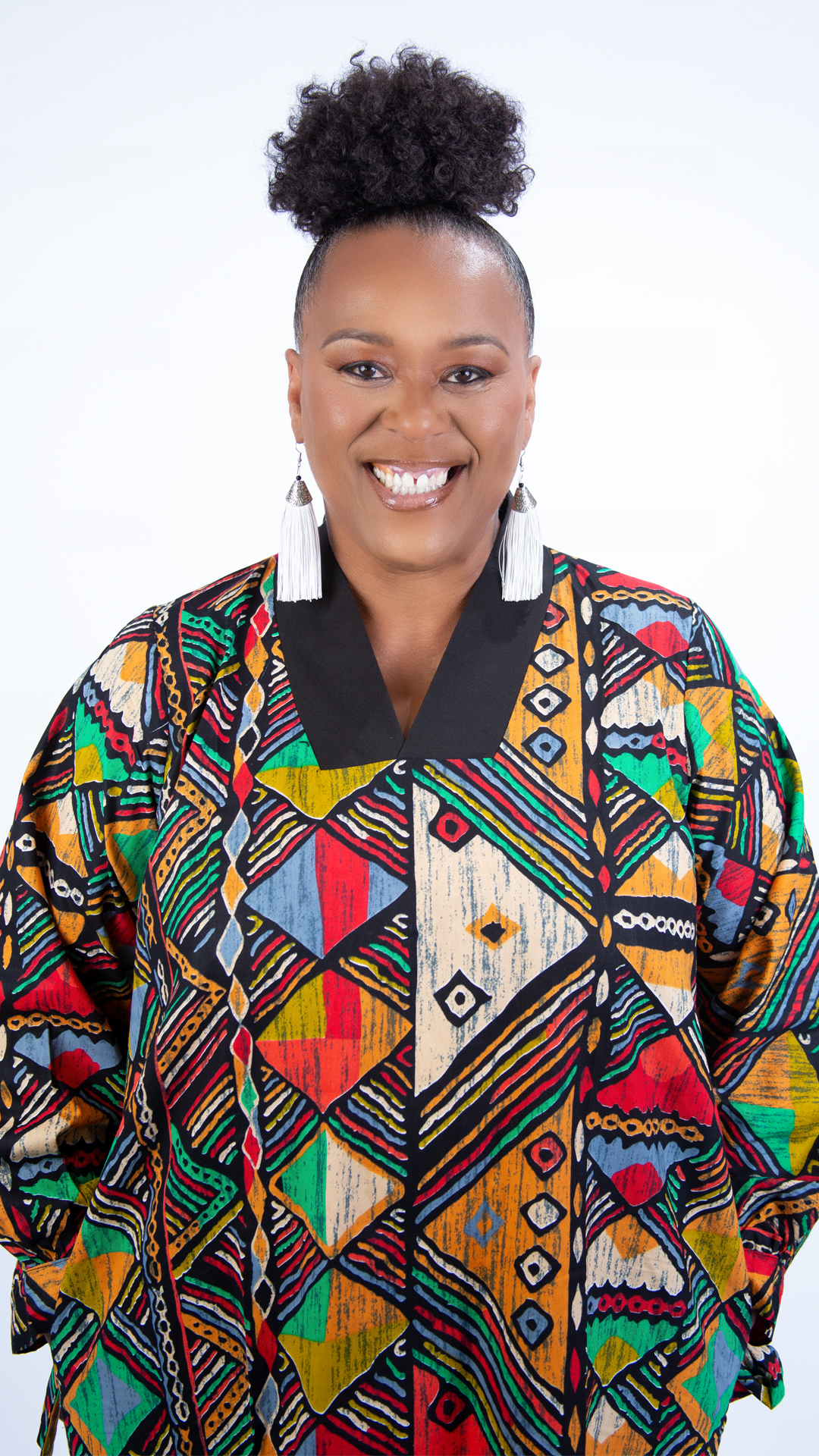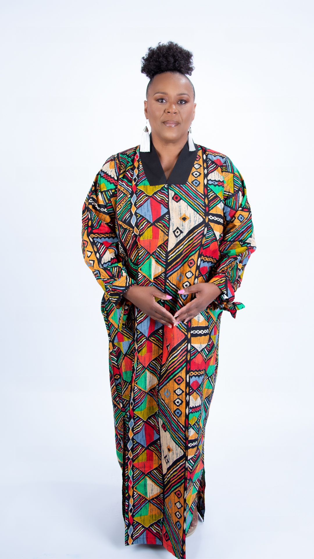 Designed with a flattering V-neckline outlined by bold black borders, this kaftan adds a touch of sophistication to its vibrant, multi-coloured design. The intricate African symbols throughout the fabric celebrate heritage and craftsmanship, while the rich mix of colours brings energy and life to the garment.