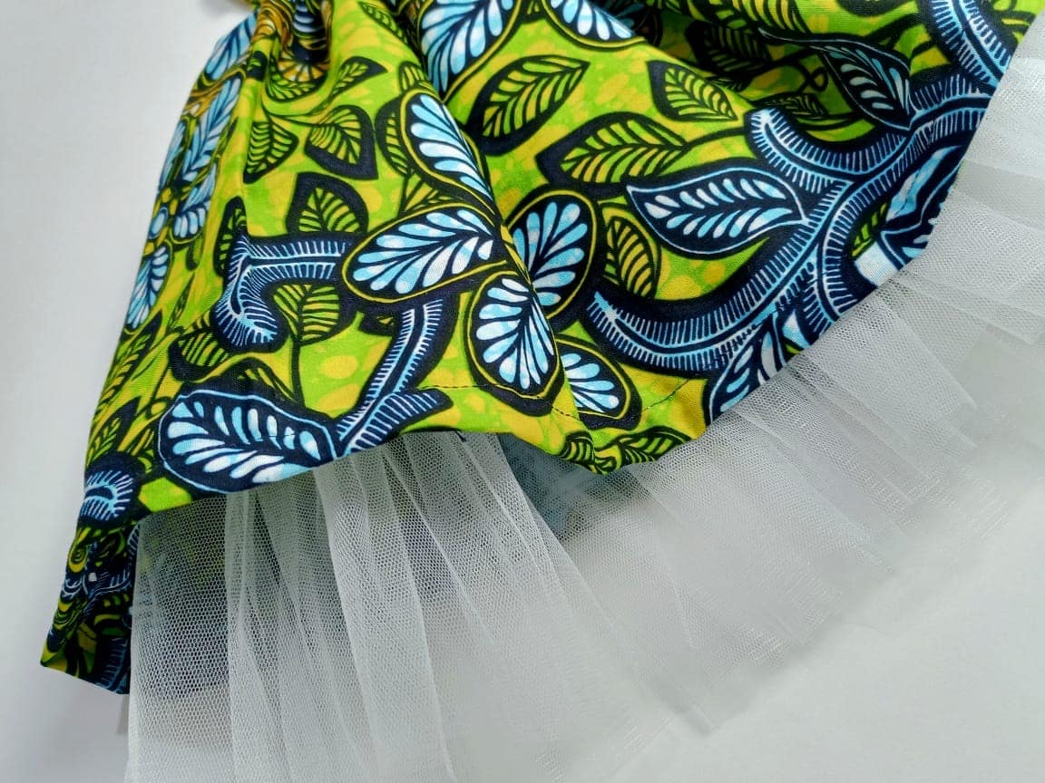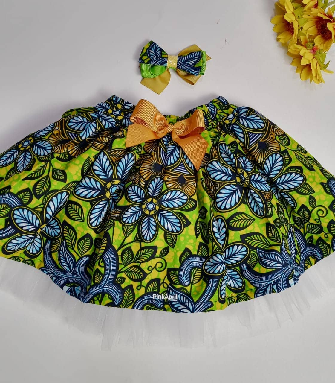 The Habiba Ankara Kids Bow & Skirt Set, is beautifully vibrant with Ankara print. Moreover, the skirt has a bow on its waistline and skirt is lined with tulle for a full, poofy look. This outfit is appropriate for all seasons. In addition this set looks great with boots and a warm sweater in the winter and with a vest and sandals in the summer.