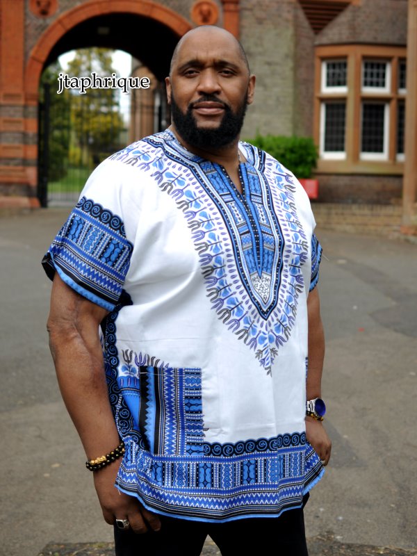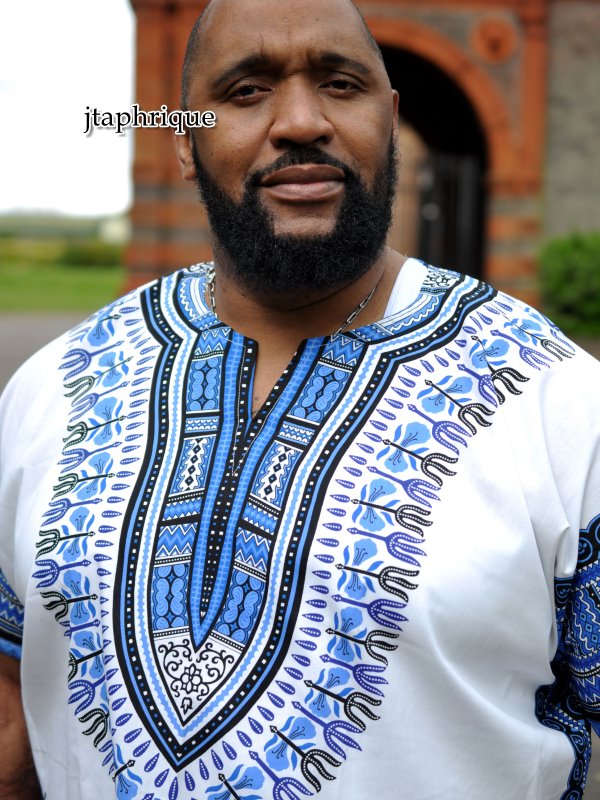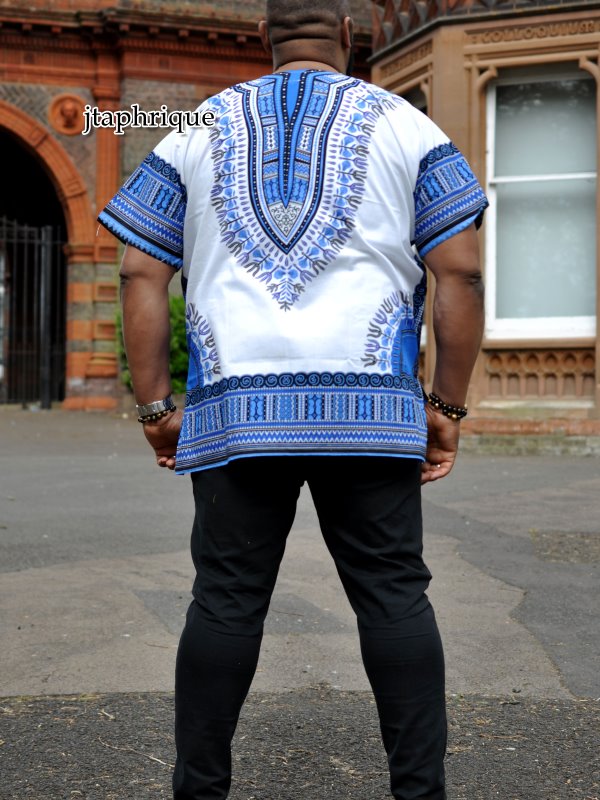Grab an amazing bargain with this men’s white and blue traditional African dashiki shirt! It is loose-fitting and made from premium quality fabric. Treat yourself or someone special to this fabulous men’s shirt / dashiki. Ideal as a gift for him. Order in many sizes including plus size XXL. Free UK delivery is available and we ship worldwide!
