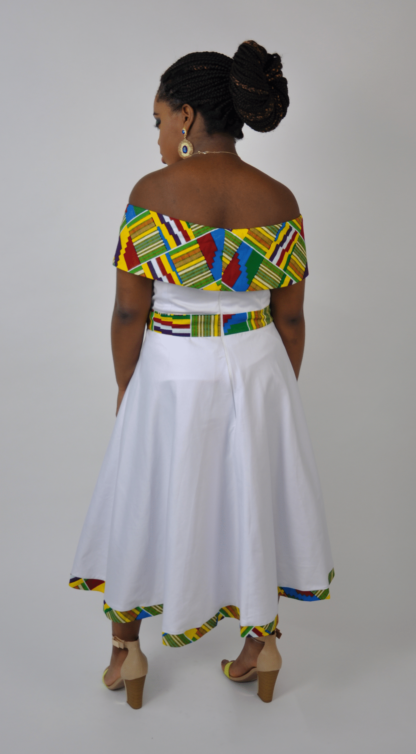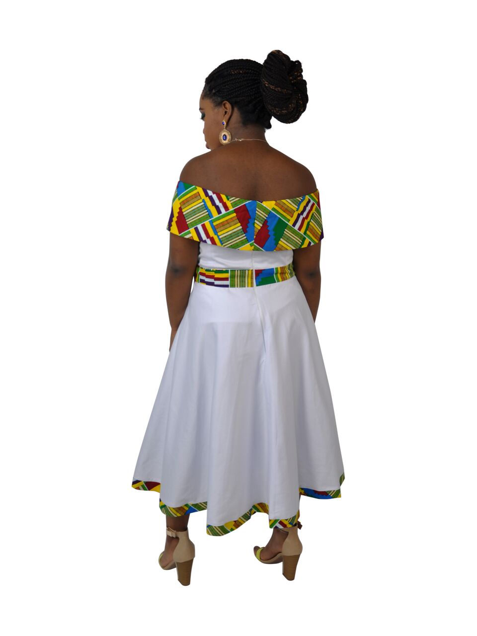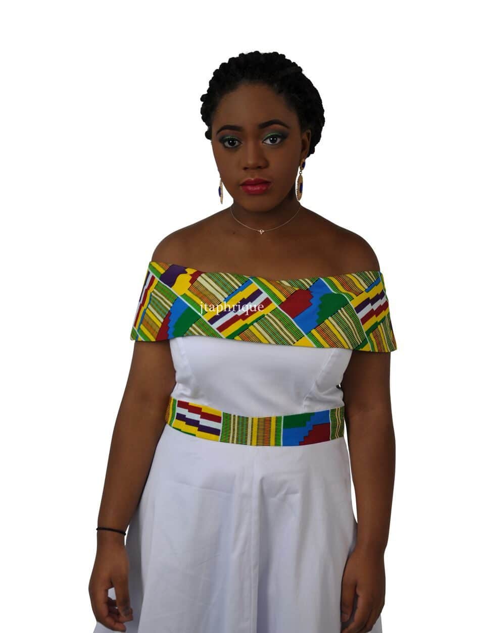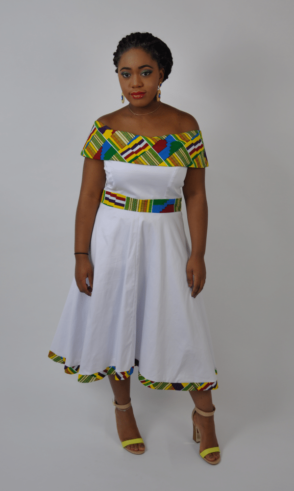 This beautiful White & Kente Fusion Skater Dress is a long skater style dress with an off-the-shoulder 50’s feel. The Kente belt, hemline, and trim adds an extra pop of colour to a classic shaped dress.Perfect piece to add to the wardrobe!This dress is sure to fit and ehance any body shape or size to extenuate any figure.To perfectly finish off the look you can ca add a beaded necklace/bracelets