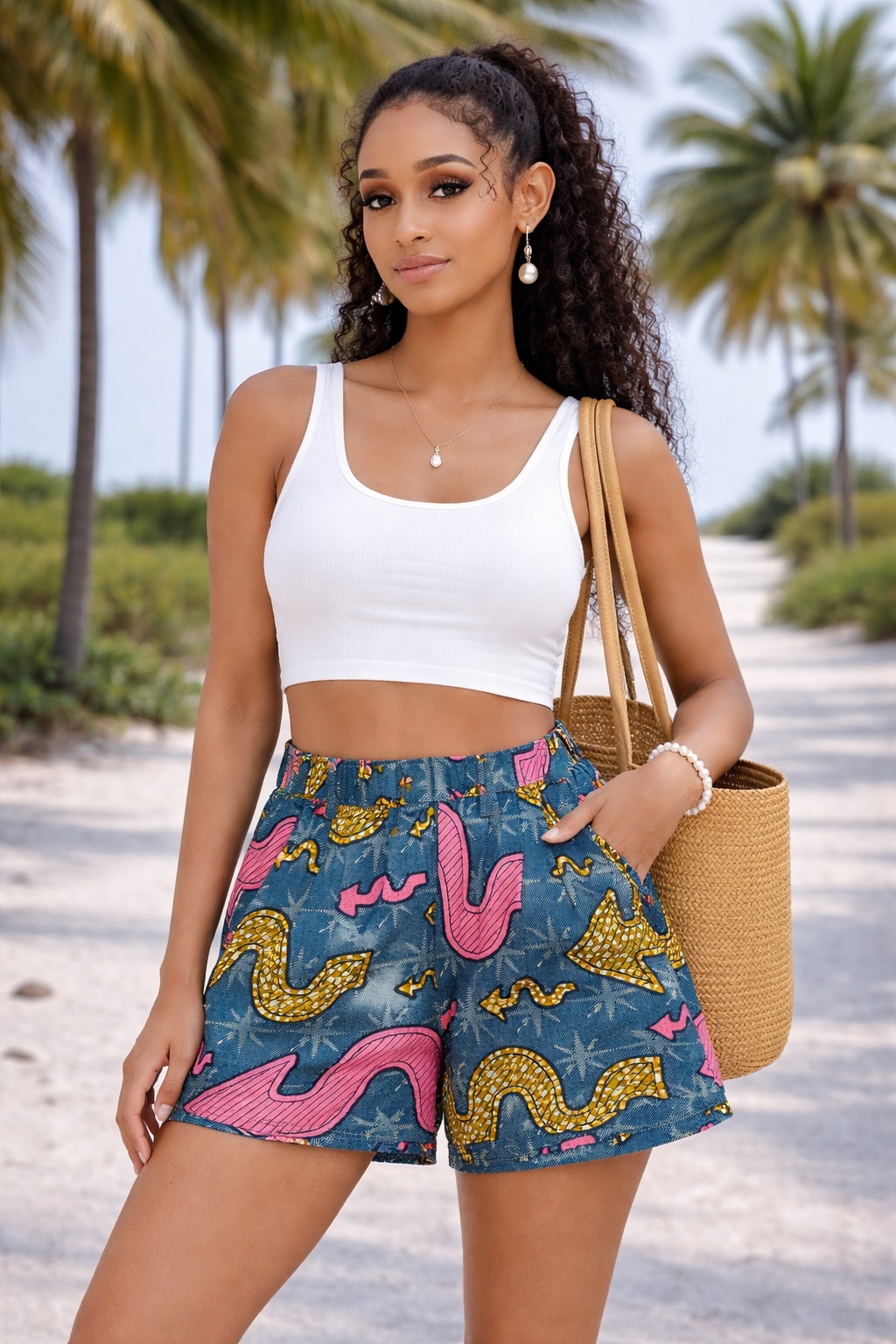 These shorts pair beautifully with crop tops, vests, blouses, or casual shirts. Likewise, they look great with sandals, trainers, or flat slippers. For example, styling them with a simple white top creates a clean and effortless summer outfit. In addition, the bold print makes it easy to create a standout look with minimal effort.