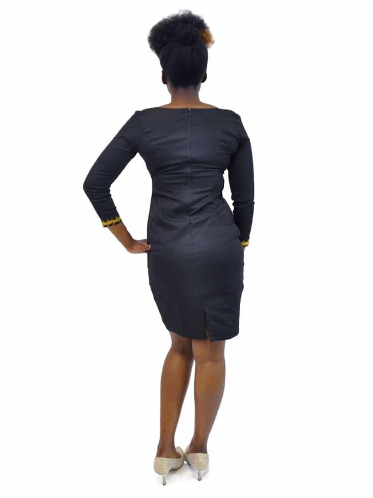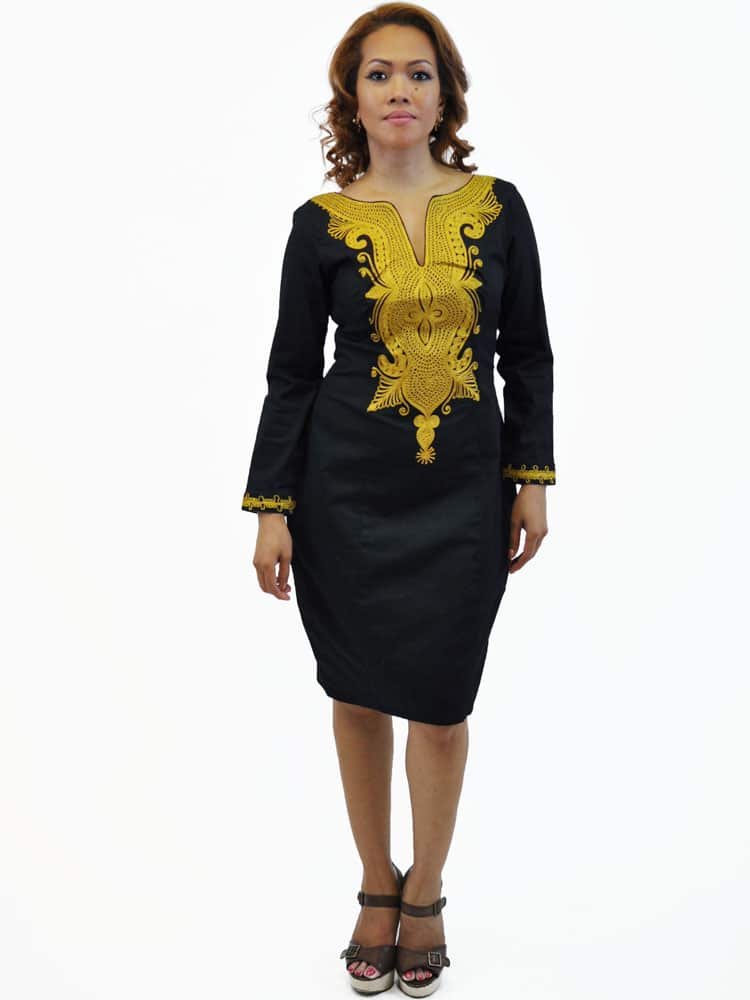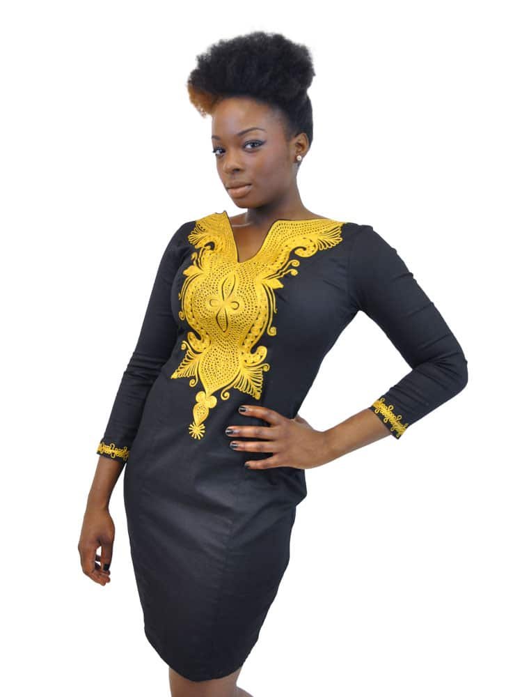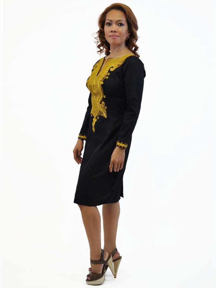 This sophisticated, embroidered, straight black dress is a must for any lady’s wardrobe. This flattering occasion piece is classic and features a gold embellished front and sleeves accentuating the flattering cut. This outfit is perfect for any occasion.