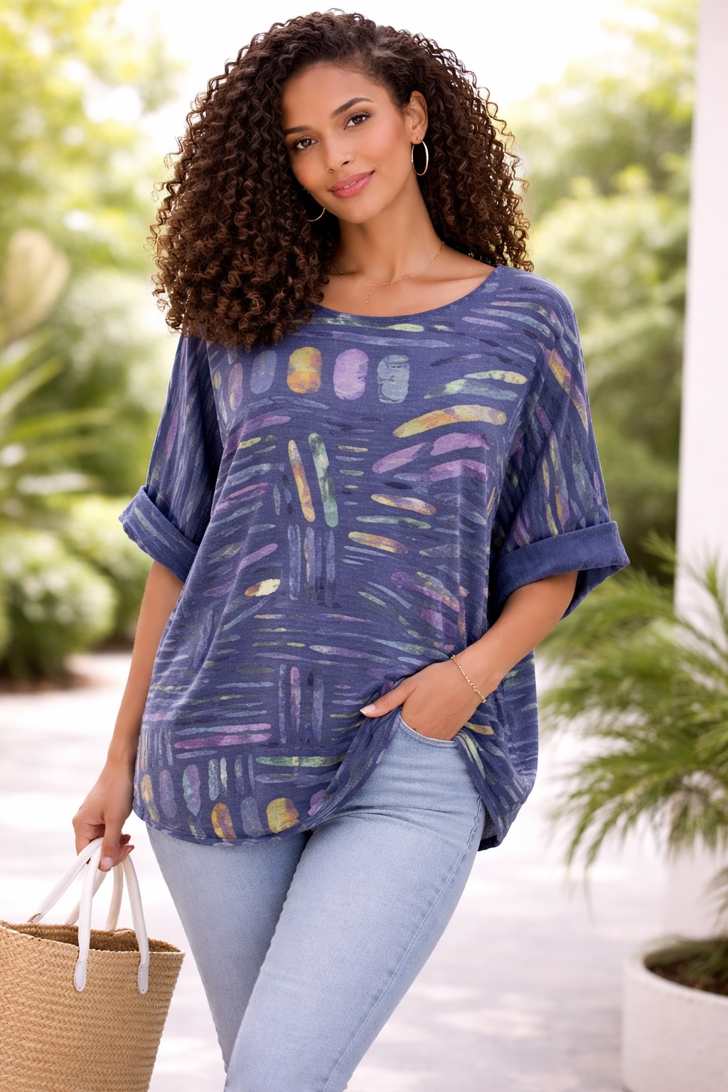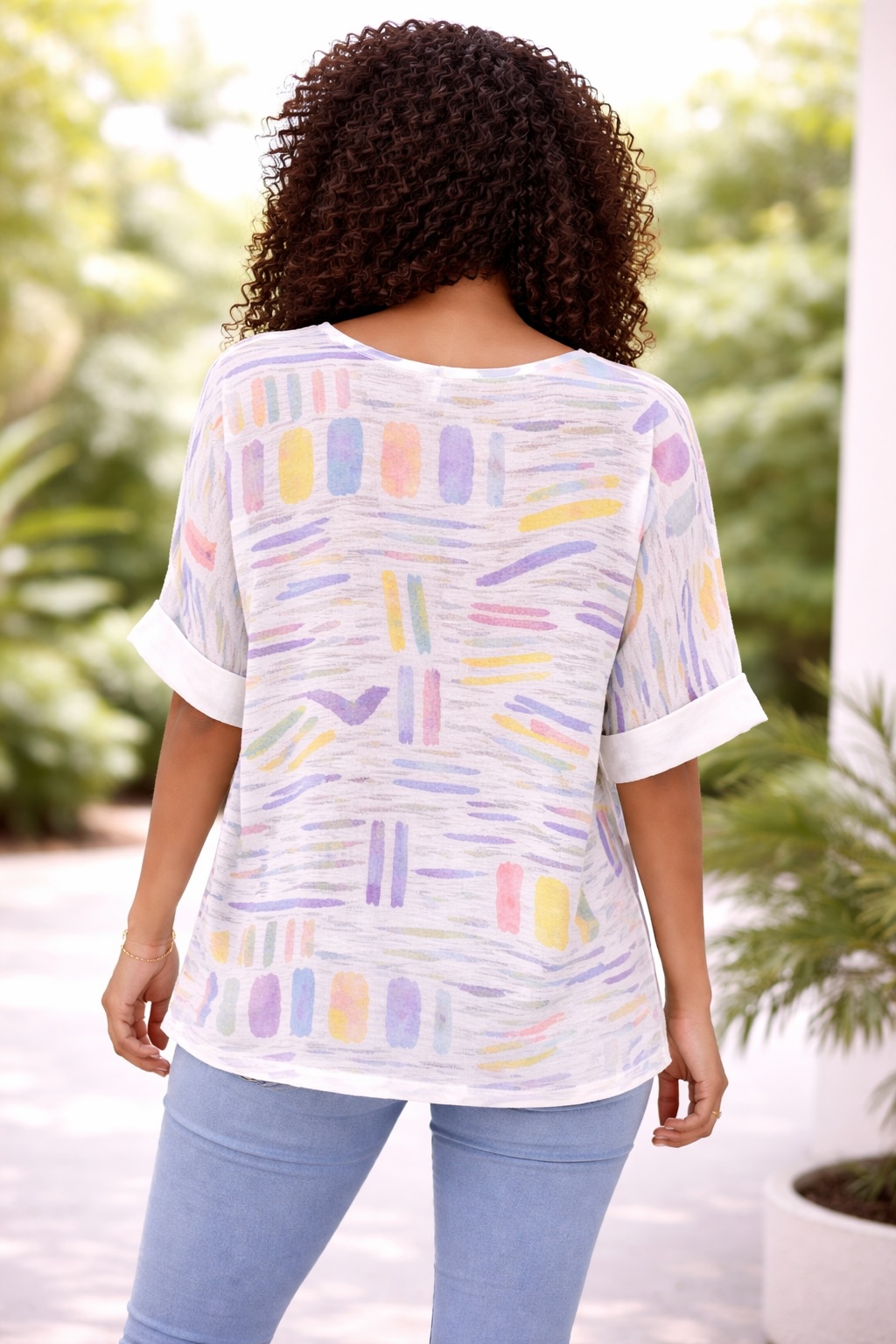 One of the standout features of this top is the eye-catching colour stick print that gives it a fresh and artistic finish. The abstract pattern adds personality and charm to the design, while the soft mix of tones keeps the overall look easy to wear.