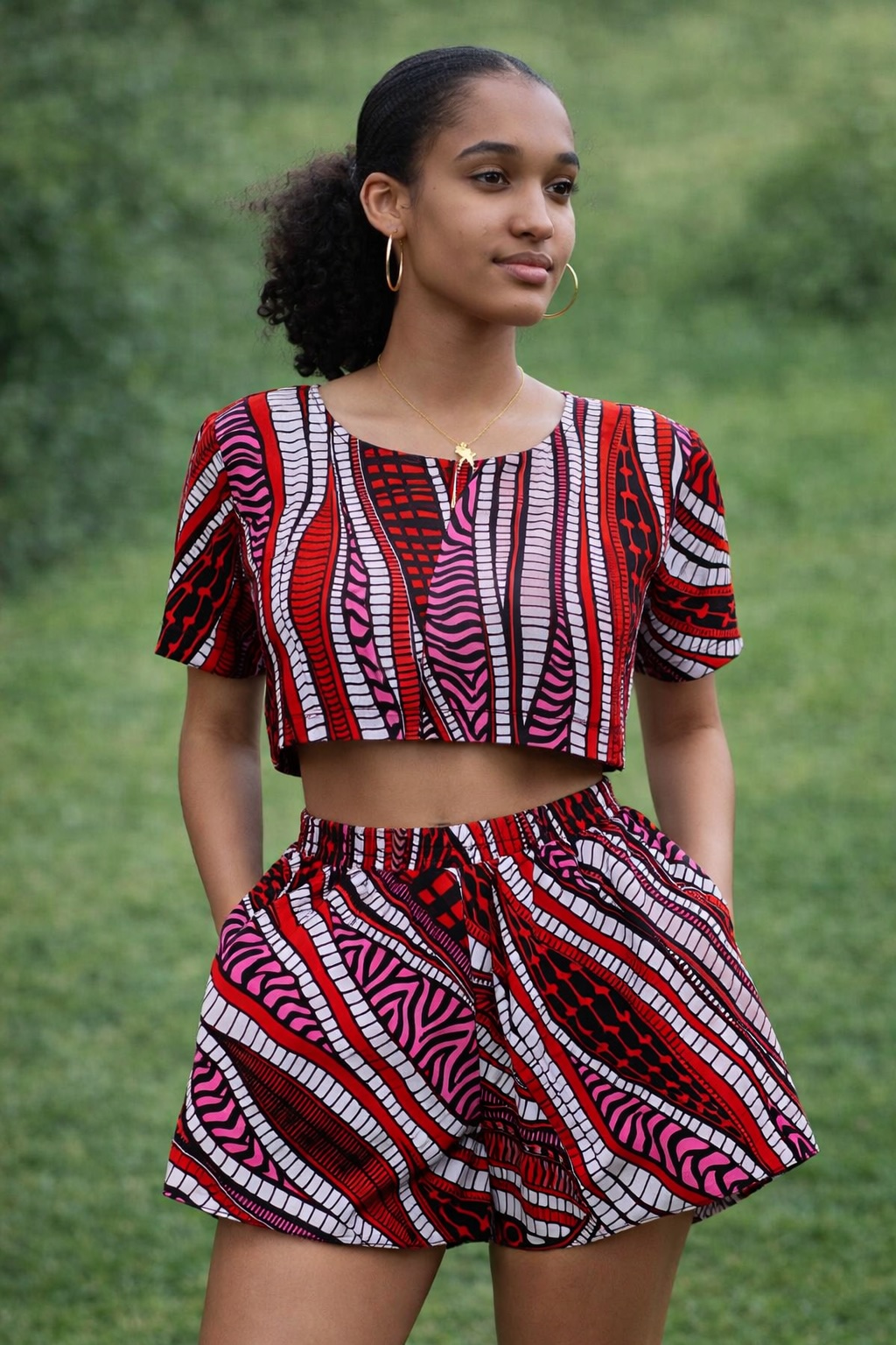Matching two-piece set, bold African print design, cropped short-sleeve top, high-waist shorts, lightweight breathable fabric, relaxed comfortable fit, and practical side pockets.