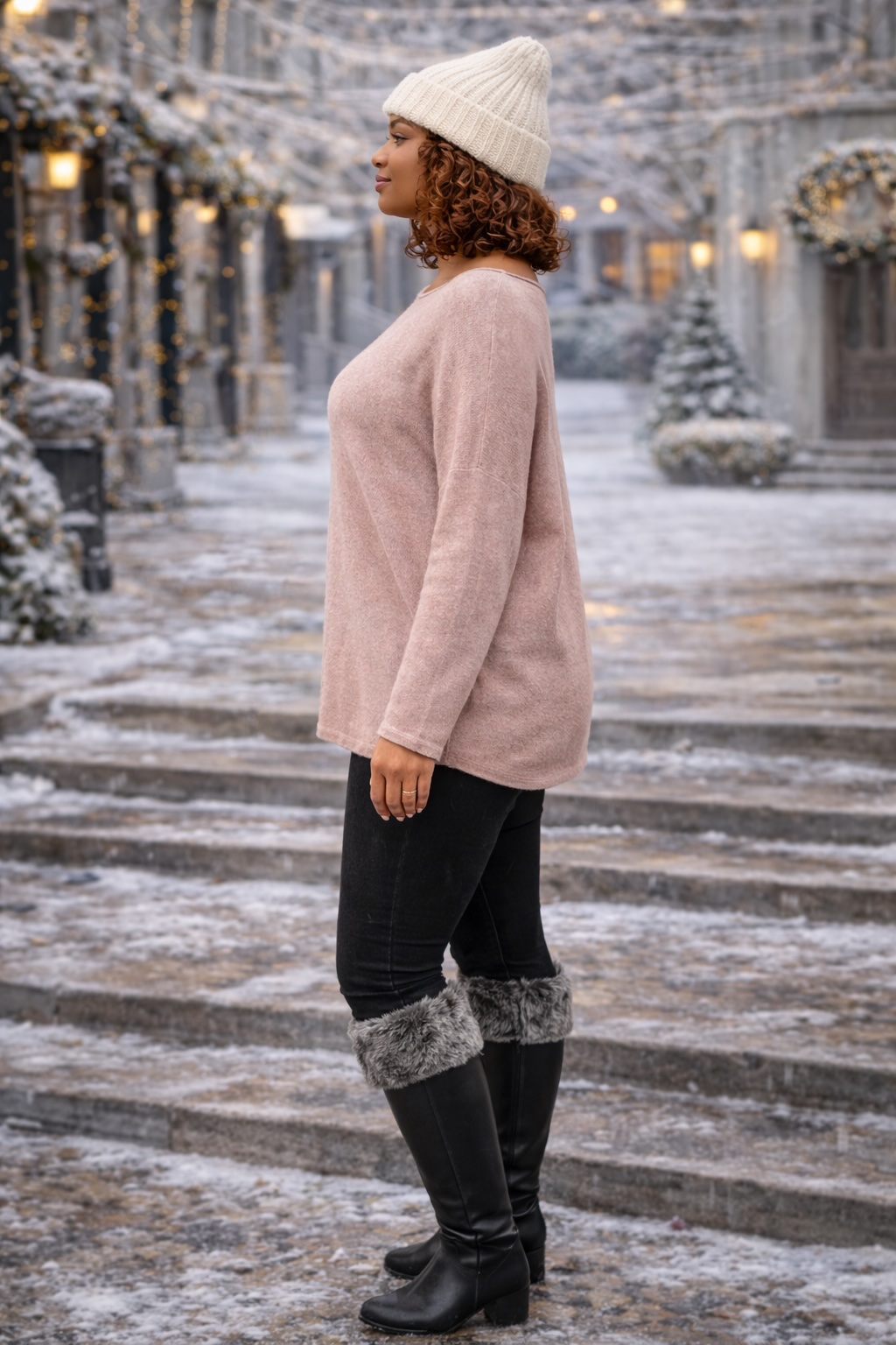 The softly curved scoop neckline creates a flattering, feminine silhouette that gently frames the neckline and collarbone. This elegant detail adds visual interest while maintaining comfort and ease of wear, giving the top a refined finish that works effortlessly for casual, smart-casual, and layered winter outfits.