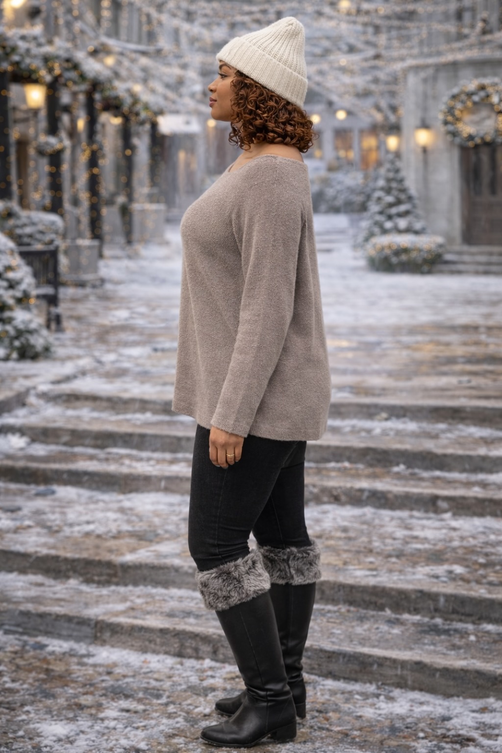 Crafted from a soft, insulating knit fabric, this top provides reliable warmth without feeling heavy or restrictive. The fabric feels gentle against the skin and offers breathable comfort, making it suitable for all-day wear indoors and outdoors. Its relaxed yet flattering silhouette drapes naturally over the body, offering a comfortable fit designed to suit all body types and sizes.