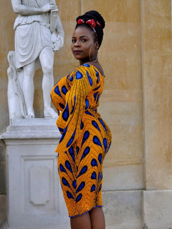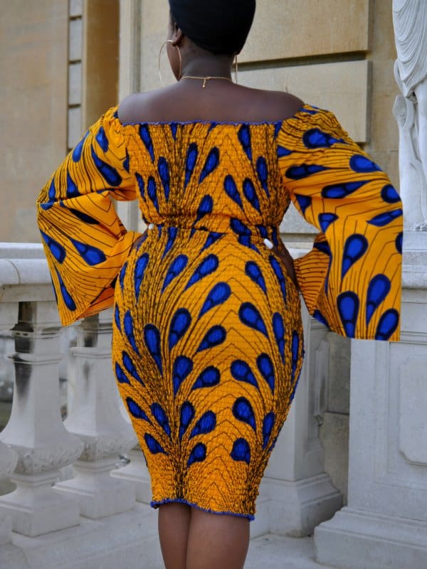 This elegant gold yellow and blue peacock African feather print (Ankara) bodycon dress is perfect for a party or occasion. With a flared bell sleeve, off shoulder design, this knee-length dress will stand you out from the crowd. With elasticated shirring in the middle on the front and back, this dress is comfortable, stretchy and adjusts beautifully to your body shape.