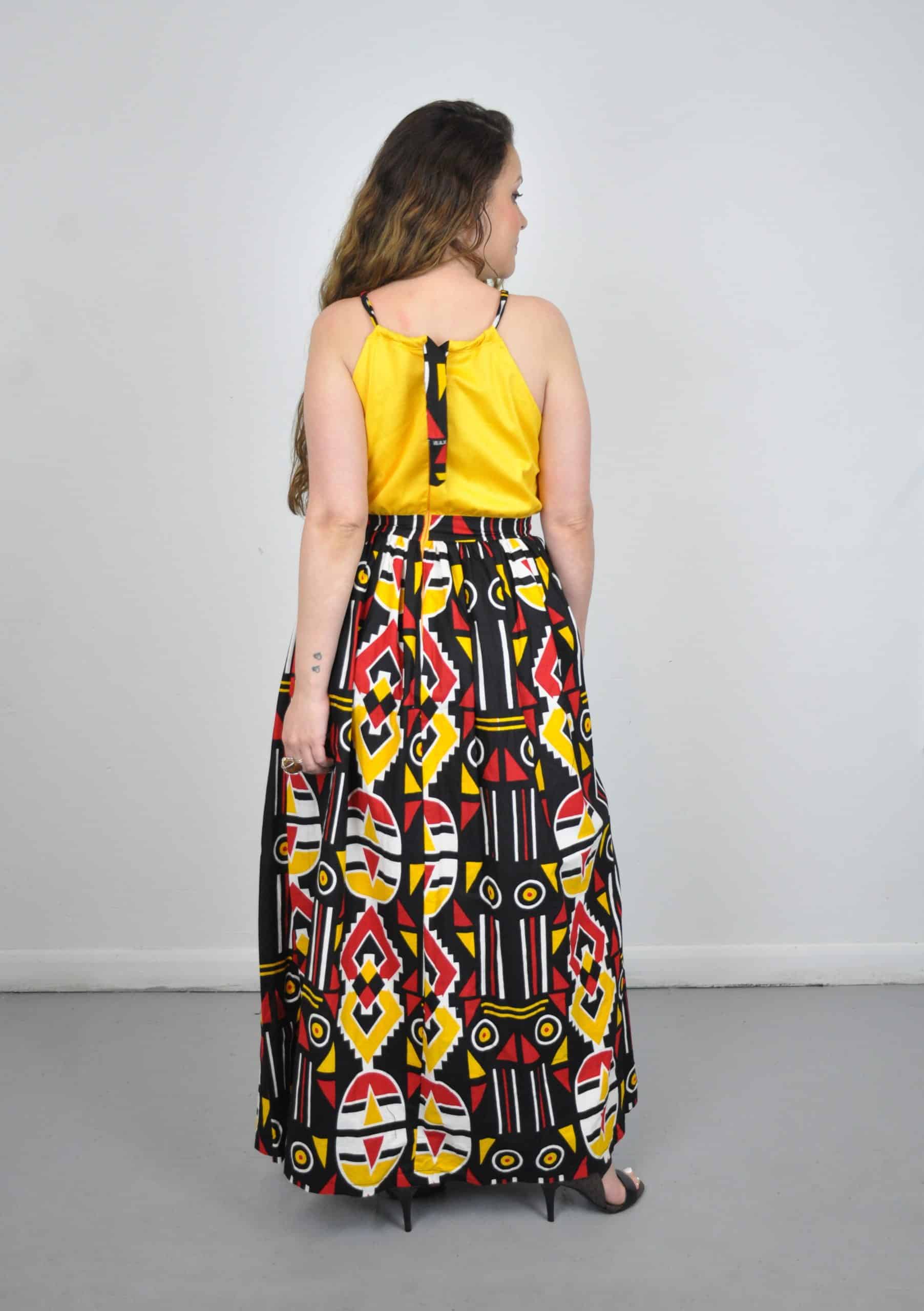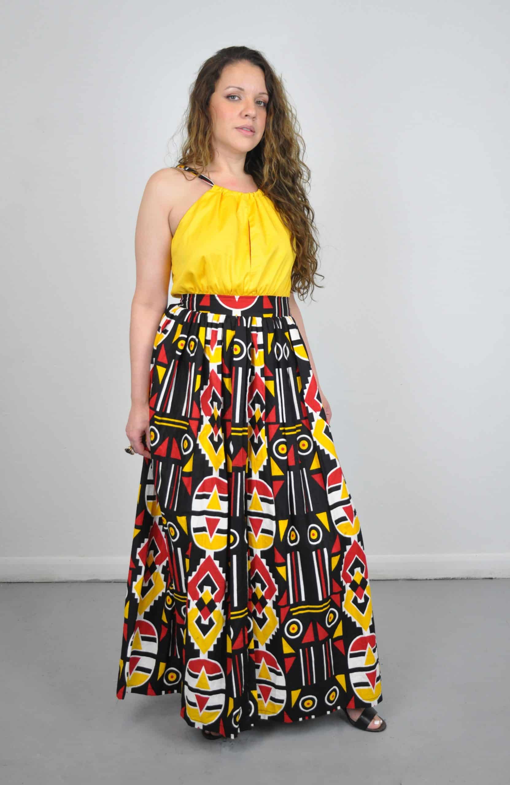 Introducing our exquisite Zaila Ankara Skirt Maxi Dress. This dress showcases the beauty of African print with its stunning long skirt, against a vibrant yellow top. Here showcasing Ankara fabric in a stylish and eye-catching manner.