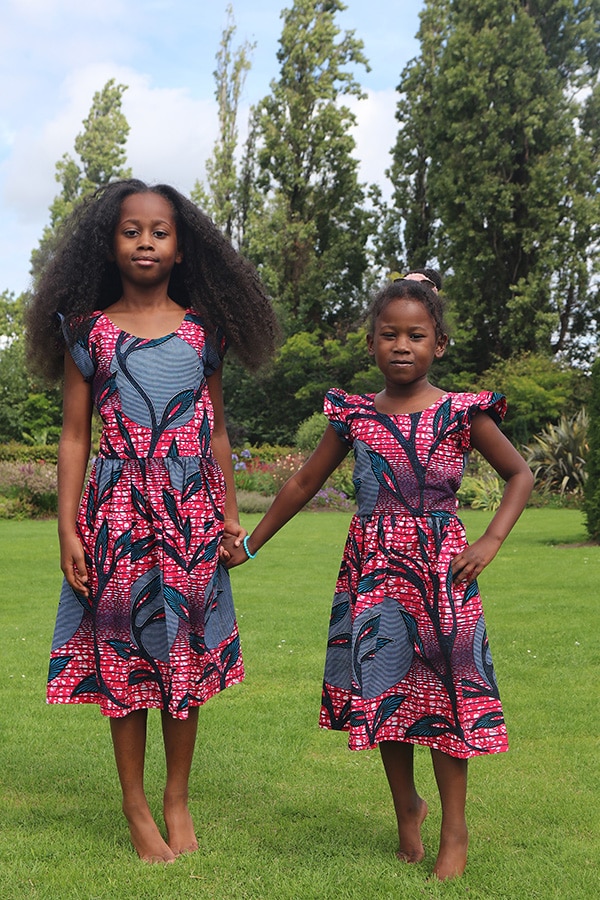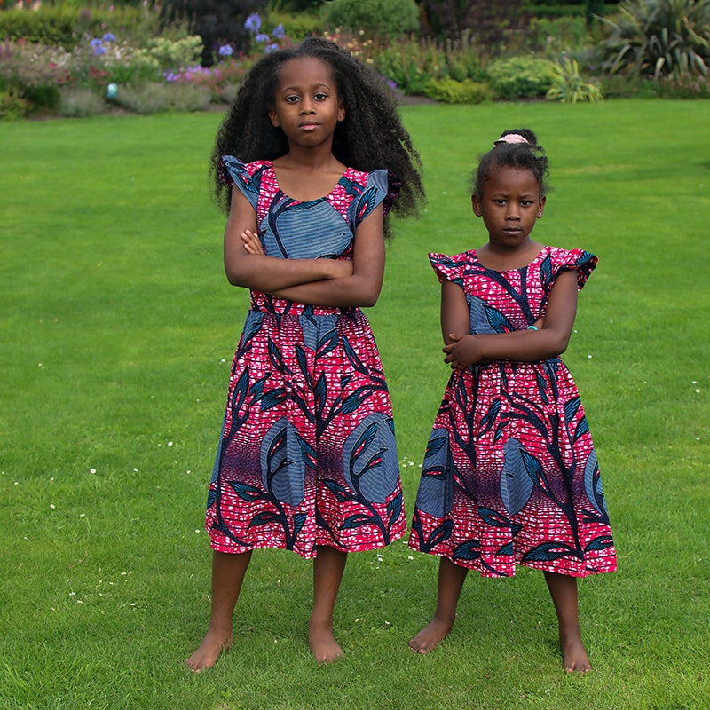 The dress is adorned with a striking Ankara print in shades of pink and blue. This lively combination of the colours blue and bright pink, reflects the childhood and celebrates the rich African tradition of vibrant and joyful prints.