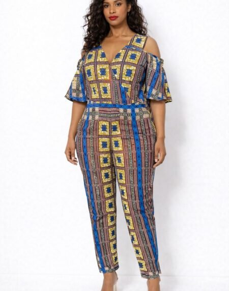 Bold African print jumpsuit crafted from vibrant wax cotton, offering comfort, cultural elegance, and effortless style for everyday wear or special occasions.