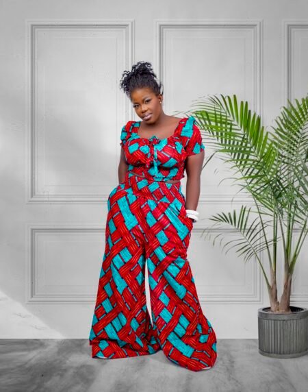 Vibrant red and blue African print co-ord with a fitted crop top and flowing wide-leg trousers. A bold, stylish set for confident, modern wear.