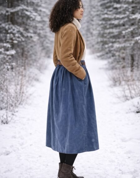 Blue pleated midi skirt with belt, perfect for winter styling. High-waisted, flattering fit, easy to style with boots and cosy layers.